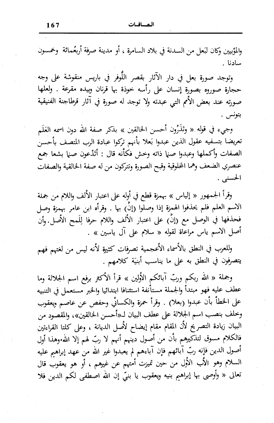 وَجُمْلَةُ اللَّهَ رَبَّكُمْ وَرَبَّ آبائِكُمُ الْأَوَّلِينَ قَرَأَ الْأَكْثَرُ بِرَفْعِ اسْمِ الْجَلَالَةِ وَمَا عُطِفَ عَلَيْهِ فَهُوَ مُبْتَدَأٌ وَالْجُمْلَةُ مُسْتَأْنَفَةٌ اسْتِئْنَافًا ابْتِدَائِيًّا وَالْخَبَرُ مُسْتَعْمَلٌ فِي التَّنْبِيهِ عَلَى الْخَطَأِ بِأَنْ عَبَدُوا بَعْلًا. وَقَرَأَ حَمْزَةُ وَالْكِسَائِيُّ وَحَفْصٌ عَنْ عَاصِمٍ وَيَعْقُوبَ وَخَلَفٍ بِنَصْبِ اسْمِ الْجَلَالَةِ عَلَى عَطْفِ الْبَيَانِ لِ أَحْسَنَ الْخالِقِينَ، وَالْمَقْصُودُ مِنَ الْبَيَانِ زِيَادَةُ التَّصْرِيحِ لِأَنَّ الْمَقَامَ مَقَامُ إِيضَاحٍ لِأَصْلِ الدِّيَانَةِ، وَعَلَى كِلْتَا الْقِرَاءَتَيْنِ فَالْكَلَامُ مَسُوقٌ لِتَذْكِيرِهِمْ بِأَنَّ مِنْ أُصُولِ دِينِهِمْ أَنَّهُمْ لَا رَبَّ لَهُمْ إِلَّا اللَّهُ، وَهَذَا أَوَّلُ أُصُولِ الدِّينِ فَإِنَّهُ رَبُّ آبَائِهِمْ فَإِنَّ آبَاءَهُمْ لَمْ يَعْبُدُوا غَيْرَ اللَّهِ مِنْ عَهْدِ إِبْرَاهِيمَ عَلَيْهِ السَّلَامُ وَهُوَ الْأَبُ الأول من حَيْثُ تَمَيَّزَتْ أُمَّتُهُمْ عَنْ غَيْرِهِمْ، أَوْ هُوَ يَعْقُوبُ قَالَ تَعَالَى: وَأَوْصَى بِها إِبْراهِيمُ بَنِيهِ وَيَعْقُوبُ يَا بَنِيَّ إِنَّ اللَّهَ اصْطَفى لَكُمُ الدِّينَ فَلا