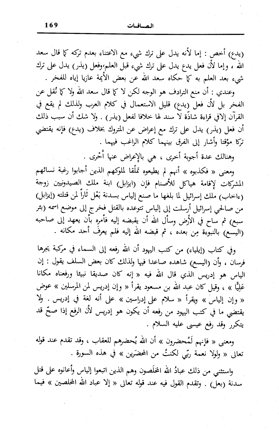 وَعِنْدِي: أَنَّ مَنْعَ التَّرَادُفِ هُوَ الْوَجْهُ لَكِنْ لَا كَمَا قَالَ سَعْدُ اللَّهِ وَلَا كَمَا نُقِلَ عَنِ الْفَخْرِ بَلْ لِأَنَّ فِعْلَ (يَدَعُ) قَلِيلُ الِاسْتِعْمَالِ فِي كَلَامِ الْعَرَبِ وَلِذَلِكَ لَمْ يَقَعْ فِي الْقُرْآنِ إِلَّا فِي قِرَاءَةٍ شَاذَّةٍ لَا سَنَدَ لَهَا خِلَافًا لِفِعْلِ (يَذَرُ) . وَلَا شَكَّ أَنَّ سَبَبَ ذَلِكَ أَنَّ فِعْلَ (يَذَرُ) يَدُلُّ عَلَى تَرْكٍ مَعَ إِعْرَاضٍ عَنِ الْمَتْرُوكِ بِخِلَافِ (يَدَعُ) فَإِنَّهُ يَقْتَضِي تَرْكًا مُؤَقَّتًا وَأَشَارَ إِلَى الْفَرْقِ بَيْنَهُمَا كَلَامُ الرَّاغِبِ فِيهِمَا. وَهُنَالِكَ عِدَّةُ أَجْوِبَةٍ أُخْرَى، هِيَ بِالْإِعْرَاضِ عَنْهَا أَحْرَى.