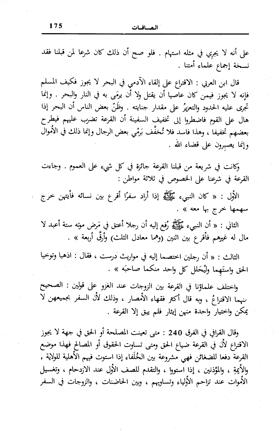 قَالَ الْقَرَافِيُّ فِي «الْفِرَقِ» (240) : مَتَى تَعَيَّنَتِ الْمَصْلَحَةُ أَوِ الْحَقُّ فِي جِهَةٍ لَا يَجُوزُ الِاقْتِرَاعُ لِأَنَّ فِي الْقُرْعَةِ ضَيَاعَ الْحَقِّ وَمَتَى تَسَاوَتِ الْحُقُوقُ أَوِ الْمَصَالِحُ فَهَذَا مَوْضِعُ الْقُرْعَةِ دَفْعَا لِلضَّغَائِنِ فَهِيَ مَشْرُوعَةٌ بَيْنَ الْخُلَفَاءِ إِذَا اسْتَوَتْ فِيهِمُ الْأَهْلِيَّة للولاية وَالْأَئِمَّة والمؤذنين إِذْ اسْتَوَوْا وَالتَّقَدُّمُ لِلصَّفِّ الْأَوَّلِ عِنْدَ الِازْدِحَامِ وَتَغْسِيلُ الْأَمْوَاتِ عِنْدَ تَزَاحُمِ الْأَوْلِيَاءِ وَتُسَاوِيهِمْ وَبَيْنَ الْحَاضِنَاتِ وَالزَّوْجَاتِ فِي السَّفَرِ