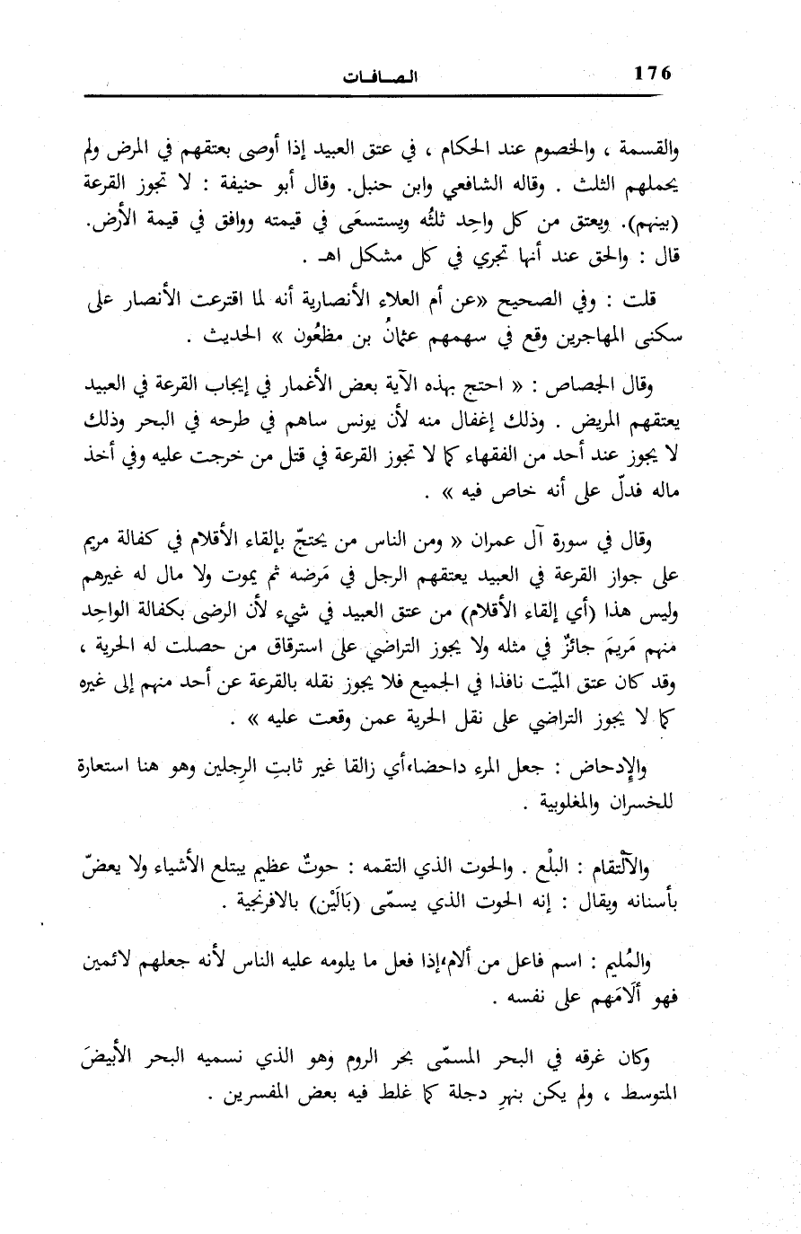 عَلَيْهِ وَفِي أَخْذِ مَالِهِ فَدَلَّ عَلَى أَنَّهُ خَاصٌّ فِيهِ) . وَقَالَ فِي سُورَةِ آلِ عِمْرَانَ: «وَمِنَ النَّاسِ مَنْ يَحْتَجُّ بِإِلْقَاءِ الْأَقْلَامِ فِي كَفَالَةِ مَرْيَمَ» عَلَى جَوَازِ الْقُرْعَةِ فِي الْعَبِيدِ يَعْتِقُهُمُ الرَّجُلُ فِي مَرَضِهِ ثُمَّ يَمُوتُ وَلَا مَالَ لَهُ غَيْرُهُمْ وَلَيْسَ هَذَا (أَيْ إِلْقَاءُ الْأَقْلَامِ) مِنْ عِتْقِ الْعَبِيدِ فِي شَيْءٍ لِأَنَّ الرِّضَى بِكَفَالَةِ الْوَاحِدِ مِنْهُمْ مَرْيَمَ جَائِزٌ فِي مِثْلِهِ وَلَا يَجُوزُ التَّرَاضِي عَلَى اسْتِرْقَاقِ مَنْ حَصَلَتْ لَهُ الْحُرِّيَّةُ، وَقَدْ كَانَ عِتْقُ الْمَيِّتِ نَافِذًا فِي الْجَمِيعِ فَلَا يَجُوزُ نَقْلُهُ بِالْقُرْعَةِ عَنْ أَحَدٍ مِنْهُمْ إِلَى غَيْرِهِ كَمَا لَا يَجُوزُ التَّرَاضِي عَلَى نَقْلِ الْحُرِّيَّةِ عَمَّنْ وَقَعَتْ عَلَيْهِ.