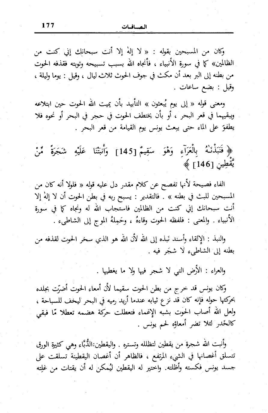 وكانَ مِنَ الْمُسَبِّحِينَ بِقَوْلِهِ: لَا إِلهَ إِلَّا أَنْتَ سُبْحانَكَ إِنِّي كُنْتُ مِنَ الظَّالِمِينَ كَمَا فِي سُورَةِ الْأَنْبِيَاءِ [87] ، فَأَنْجَاهُ اللَّهُ بِسَبَبِ تَسْبِيحِهِ وَتَوْبَتِهِ فَقَذَفَهُ الْحُوتُ مِنْ بَطْنِهِ إِلَى الْبَرِّ بَعْدَ أَنْ مَكَثَ فِي جَوْفِ الْحُوتِ ثَلَاثَ لَيَالٍ، وَقِيلَ: يَوْمًا وَلَيْلَةً، وَقِيلَ: بِضْعَ سَاعَاتٍ.