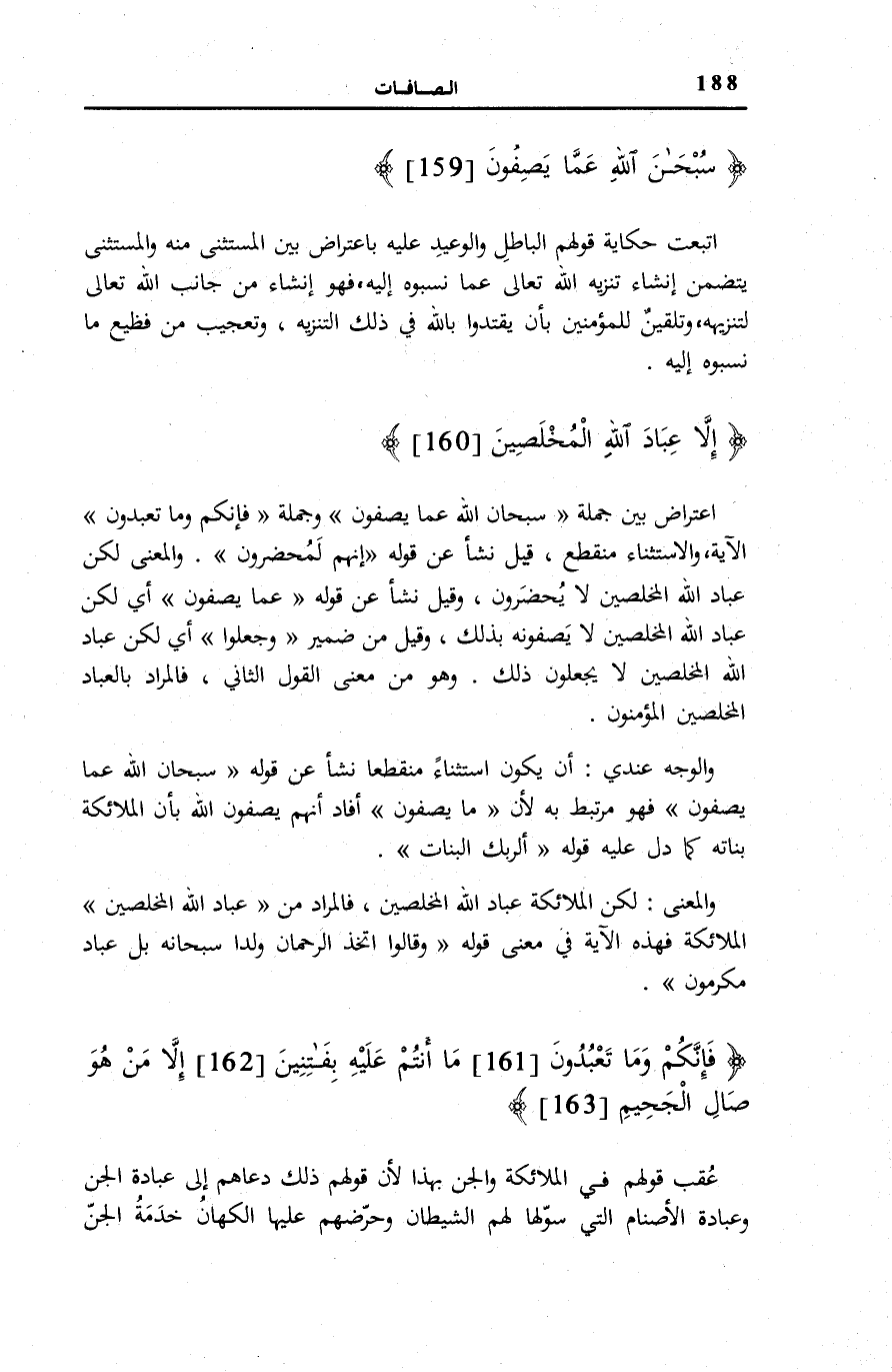 اعْتِرَاضٌ بَيْنَ جُمْلَةِ سُبْحانَ اللَّهِ عَمَّا يَصِفُونَ [الصافات: 159] وَجُمْلَةِ فَإِنَّكُمْ وَما تَعْبُدُونَ [الصافات: 161] الْآيَةَ، وَالِاسْتِثْنَاءُ مُنْقَطِعٌ، قِيلَ نَشأ عَن قَوْلهم: إِنَّهُمْ لَمُحْضَرُونَ [الصافات: 158] وَالْمَعْنَى لَكِنَّ عِبَادَ اللَّهِ الْمُخْلَصِينَ لَا يُحْضَرُونَ، وَقِيلَ نَشَأَ عَنْ قَوْلِهِ: عَمَّا يَصِفُونَ [الصافات: 159] أَيْ لَكِنَّ عِبَادَ اللَّهِ الْمُخَلَصِينَ لَا يَصِفُونَهُ بِذَلِكَ، وَقِيلَ مِنْ ضمير وَجَعَلُوا [الصافات: 158] أَيْ لَكِنَّ عِبَادَ اللَّهِ الْمُخْلَصِينَ لَا يَجْعَلُونَ ذَلِكَ. وَهُوَ مِنْ مَعْنَى الْقَوْلِ الثَّانِي، فَالْمُرَادُ بِالْعِبَادِ الْمُخْلَصِينَ الْمُؤْمِنُونَ.