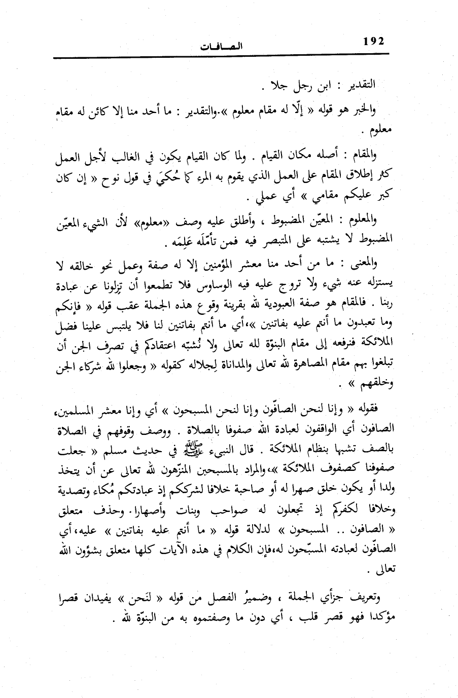التَّقْدِيرُ: ابْنُ رَجُلٍ جَلَا. وَالْخَبَرُ هُوَ قَوْلُهُ: إِلَّا لَهُ مَقامٌ مَعْلُومٌ. وَالتَّقْدِيرُ: مَا أَحَدٌ مِنَّا إِلَّا كَائِنٌ لَهُ مَقَامٌ مَعْلُومٌ.