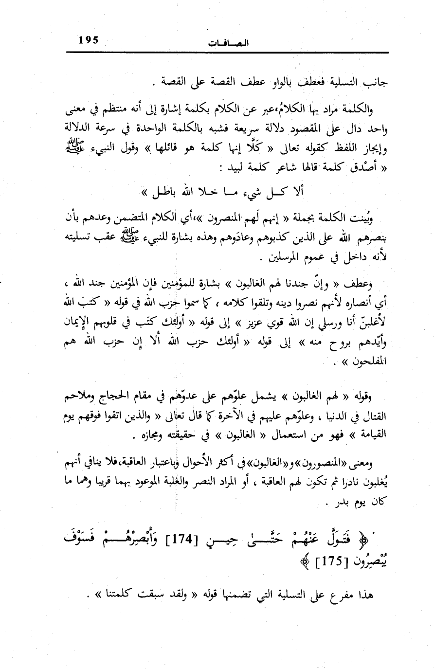 وَبُيِّنَتِ الْكَلِمَةُ بِجُمْلَةِ إِنَّهُمْ لَهُمُ الْمَنْصُورُونَ، أَيِ الْكَلَامُ الْمُتَضَمِّنُ وَعْدَهُمْ بِأَنْ يَنْصُرَهُمُ اللَّهُ عَلَى الَّذِينَ كَذَّبُوهُمْ وَعَادَوْهُمْ وَهَذِهِ بِشَارَة للنبيء صَلَّى اللهُ عَلَيْهِ وَسَلَّمَ عَقِبَ تَسْلِيَتِهِ لِأَنَّهُ دَاخِلٌ فِي عُمُومِ الْمُرْسَلِينَ.