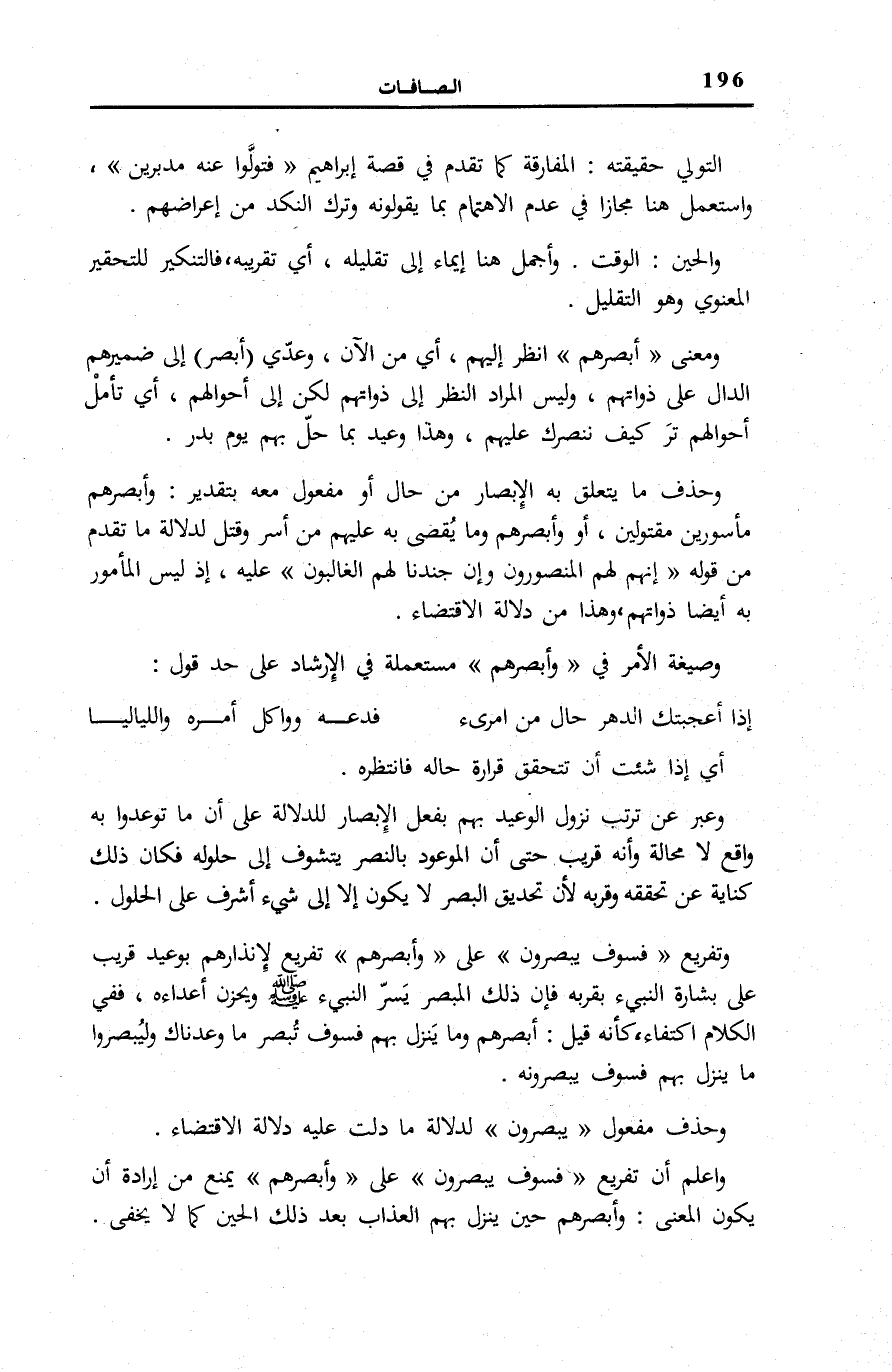 وَحُذِفَ مَا يَتَعَلَّقُ بِهِ الْإِبْصَارُ مِنْ حَالٍ أَوْ مَفْعُولٍ مَعَهُ بِتَقْدِيرِ: وَأَبْصِرْهُمْ مَأْسُورِينَ مَقْتُولِينَ، أَوْ وَأَبْصِرْهُمْ وَمَا يُقْضَى بِهِ عَلَيْهِمْ مِنْ أَسْرٍ وَقَتْلٍ لِدَلَالَةِ مَا تَقَدَّمَ مِنْ قَوْلِهِ: إِنَّهُمْ لَهُمُ الْمَنْصُورُونَ وَإِنَّ جُنْدَنا لَهُمُ الْغالِبُونَ [الصافات: 172، 173] عَلَيْهِ، إِذْ لَيْسَ الْمَأْمُورُ بِهِ أَيْضًا ذَوَاتِهِمْ، وَهَذَا مِنْ دَلَالَةِ الِاقْتِضَاءِ. وَصِيغَةُ الْأَمْرِ فِي وَأَبْصِرْهُمْ مُسْتَعْمَلَةٌ فِي الْإِرْشَادِ عَلَى حَدِّ قَوْلِ: