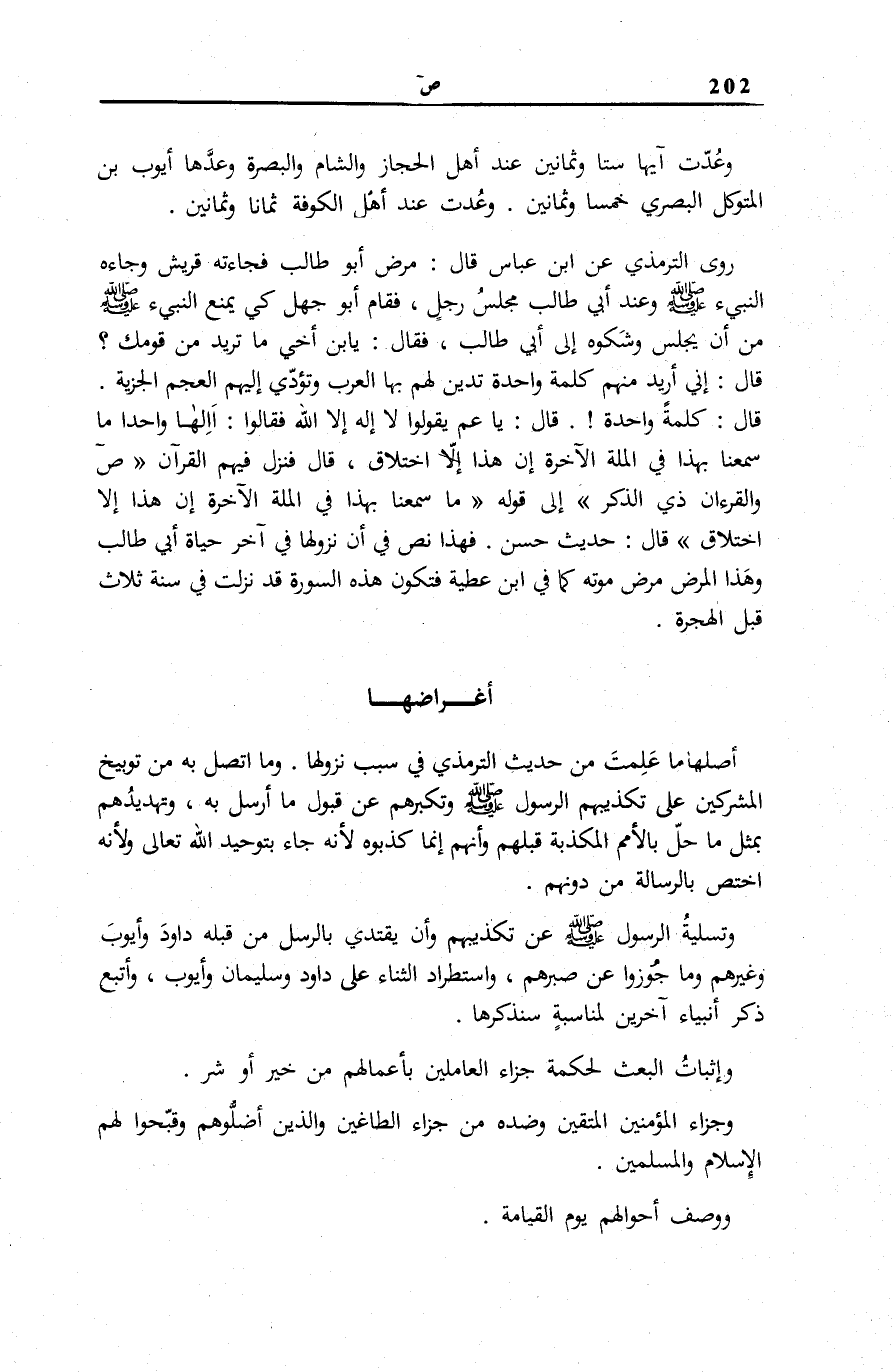 وَعِنْدَ أَبِي طَالِبٍ مَجْلِسُ رَجُلٍ، فَقَامَ أَبُو جهل كي يمْنَع النبيء صَلَّى اللهُ عَلَيْهِ وَسَلَّمَ مِنْ أَنْ يَجْلِسَ وَشَكَوْهُ إِلَى أَبِي طَالِبٍ، فَقَالَ: يَا بْنَ أَخِي مَا تُرِيدُ مِنْ قَوْمِكَ؟ قَالَ: إِنِّي أُرِيدُ مِنْهُمْ كَلِمَةً وَاحِدَةً تَدِينُ لَهُمْ بِهَا الْعَرَبُ وَتُؤَدِّي إِلَيْهِمُ الْعَجَمُ الْجِزْيَةَ. قَالَ: كَلِمَةً وَاحِدَةً! قَالَ: يَا عَمِّ يَقُولُوا لَا إِلَهَ إِلَّا اللَّهُ فَقَالُوا: أَإِلَهًا وَاحِدًا مَا سَمِعْنَا بِهَذَا فِي الْمِلَّةِ الْآخِرَةِ إِنْ هَذَا إِلَّا اخْتِلَاقٌ، قَالَ فَنَزَلَ فِيهِمُ الْقُرْآنُ ص وَالْقُرْآنِ ذِي الذِّكْرِ [ص: 1] إِلَى قَوْلِهِ: مَا سَمِعْنا بِهذا فِي الْمِلَّةِ الْآخِرَةِ إِنْ هَذَا إِلَّا اخْتِلاقٌ [ص: 7] قَالَ: حَدِيثٌ حَسَنٌ. فَهَذَا نَصٌّ فِي أَنَّ نُزُولَهَا فِي آخِرِ حَيَاةِ أَبِي طَالِبٍ وَهَذَا الْمَرَضُ مَرَضُ مَوْتِهِ كَمَا فِي ابْنِ عَطِيَّةَ فَتَكُونُ هَذِهِ السُّورَةُ قَدْ نَزَلَتْ فِي سَنَةِ ثَلَاثٍ قَبْلَ الْهِجْرَةِ.