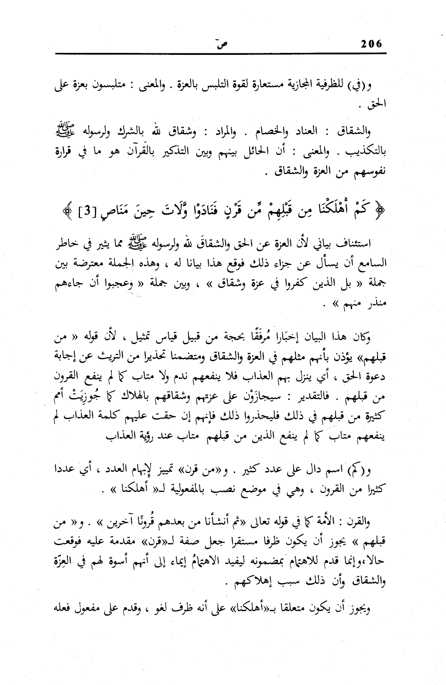 اسْتِئْنَافٌ بَيَانِيٌّ لِأَنَّ الْعِزَّةَ عَنِ الْحَقِّ وَالشِّقَاقَ لله وَلِرَسُولِهِ صَلَّى اللهُ عَلَيْهِ وَسَلَّمَ مِمَّا يُثِيرُ فِي خَاطِرِ السَّامِعِ أَنْ يَسْأَلَ عَنْ جَزَاءِ ذَلِكَ فَوَقَعَ هَذَا بَيَانًا لَهُ، وَهَذِهِ الْجُمْلَةُ مُعْتَرِضَةٌ بَيْنَ جُمْلَةِ بَلِ الَّذِينَ كَفَرُوا فِي عِزَّةٍ وَشِقاقٍ [ص: 2] ، وَبَيْنَ جُمْلَةِ وَعَجِبُوا أَنْ جاءَهُمْ مُنْذِرٌ مِنْهُمْ [ص: 4] .