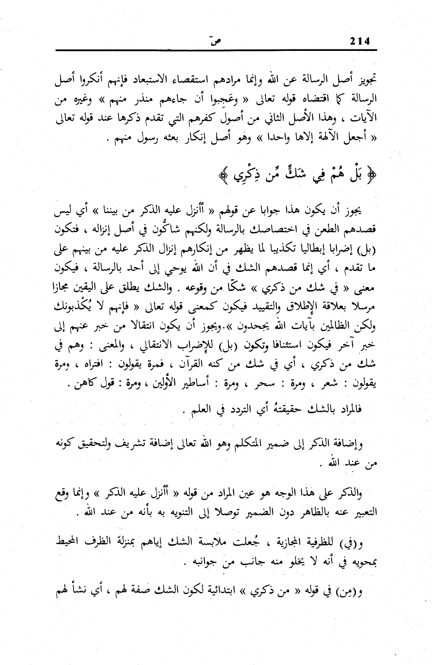 يَجُوزُ أَنْ يَكُونَ هَذَا جَوَابًا عَنْ قَوْلِهِمْ: أَأُنْزِلَ عَلَيْهِ الذِّكْرُ مِنْ بَيْنِنا أَيْ لَيْسَ قَصْدُهُمُ الطَّعْنَ فِي اخْتِصَاصِكَ بِالرِّسَالَةِ وَلَكِنَّهُمْ شَاكُّونَ فِي أَصْلِ إِنْزَالِهِ، فَتَكُونُ بَلْ إِضْرَابًا إِبْطَالِيَّا تَكْذِيبًا لِمَا يَظْهَرُ مِنْ إِنْكَارِهِمْ إِنْزَالَ الذِّكْرِ عَلَيْهِ مِنْ بَيْنِهِمْ عَلَى مَا تَقَدَّمَ، أَيْ إِنَّمَا قَصْدُهُمُ الشَّكُ فِي أَنَّ اللَّهَ يُوحِي إِلَى أَحَدٍ بِالرِّسَالَةِ، فَيَكُونُ مَعْنَى فِي شَكٍّ مِنْ ذِكْرِي شَكًّا مِنْ وُقُوعِهِ. وَالشَّكُّ يُطْلَقُ عَلَى الْيَقِينِ مَجَازًا مُرْسَلًا بِعَلَاقَةِ الْإِطْلَاقِ وَالتَّقْيِيدِ فَيَكُونُ كَمَعْنَى قَوْلِهِ تَعَالَى: فَإِنَّهُمْ لَا يُكَذِّبُونَكَ وَلكِنَّ الظَّالِمِينَ بِآياتِ اللَّهِ يَجْحَدُونَ [الْأَنْعَام: 33] . وَيَجُوزُ أَنْ يَكُونَ انْتِقَالًا مِنْ خَبَرٍ عَنْهُمْ إِلَى خَبَرٍ آخَرَ فَيَكُونُ اسْتِئْنَافًا وَتَكُونُ بَلْ لِلْإِضْرَابِ الِانْتِقَالِيِّ، وَالْمَعْنَى: وَهُمْ فِي شَكٍّ مِنْ ذِكْرِي، أَيْ فِي شَكٍّ مِنْ كُنْهِ الْقُرْآنِ، فَمَرَّةً يَقُولُونَ: افْتَرَاهُ، وَمَرَّةً يَقُولُونَ: شِعْرٌ، وَمَرَّةً: سِحْرٌ، وَمَرَّةً: أَسَاطِيرُ الْأَوَّلِينَ، وَمَرَّةً: قَوْلُ كَاهِنٍ. فَالْمُرَادُ بِالشَّكِّ حَقِيقَتُهُ أَيِ التَّرَدُّدُ فِي الْعِلْمِ. وَإِضَافَةُ الذِّكْرِ إِلَى ضَمِيرِ الْمُتَكَلِّمِ وَهُوَ اللَّهُ تَعَالَى إِضَافَةُ تَشْرِيفٍ وَلِتَحْقِيقِ كَوْنِهِ مِنْ عِنْدِ اللَّهِ. وَالذِّكْرُ عَلَى هَذَا الْوَجْهِ هُوَ عَيْنُ الْمُرَادِ مِنْ قَوْلِهِ: أَأُنْزِلَ عَلَيْهِ الذِّكْرُ وَإِنَّمَا وَقَعَ التَّعْبِيرُ عَنْهُ بِالظَّاهِرِ دُونَ الضَّمِيرِ تَوَصُّلًا إِلَى التَّنْوِيهِ بِهِ بِأَنَّهُ مِنْ عِنْدِ اللَّهِ.