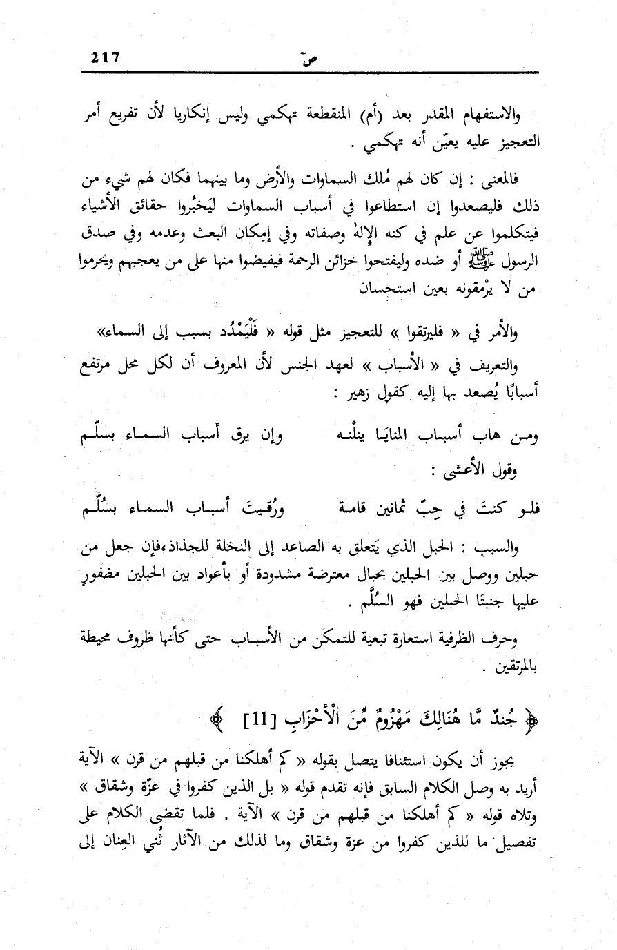 وَالِاسْتِفْهَامُ الْمُقَدَّرُ بَعْدَ أَمْ الْمُنْقَطِعَةِ تَهَكُّمِيٌّ وَلَيْسَ إِنْكَارِيًا لِأَنَّ تَفْرِيعَ أَمْرِ التَّعْجِيزِ عَلَيْهِ يُعَيِّنُ أَنَّهُ تَهَكُّمِيٌّ. فَالْمَعْنَى: إِنْ كَانَ لَهُمْ مُلْكُ السَّمَاوَاتِ وَالْأَرْضِ وَمَا بَيْنَهُمَا فَكَانَ لَهُمْ شَيْءٌ مِنْ ذَلِكَ فَلْيَصَّعَّدُوا إِنِ اسْتَطَاعُوا فِي أَسْبَابِ السَّمَاوَاتِ لِيُخْبَرُوا حَقَائِقَ الْأَشْيَاءِ فَيَتَكَلَّمُوا عَنْ عِلْمٍ فِي كُنْهِ الْإِلَهِ وَصِفَاتِهِ وَفِي إِمْكَانِ الْبَعْثِ وَعَدَمِهِ وَفِي صدق الرَّسُول صَلَّى اللهُ عَلَيْهِ وَسَلَّمَ أَوْ ضِدِّهِ وَلِيَفْتَحُوا خَزَائِنَ الرَّحْمَةِ فَيُفِيضُوا مِنْهَا عَلَى مَنْ يُعْجِبُهُمْ وَيَحْرِمُوا مَنْ لَا يَرْمُقُونَهُ بِعَيْنِ اسْتِحْسَانٍ.