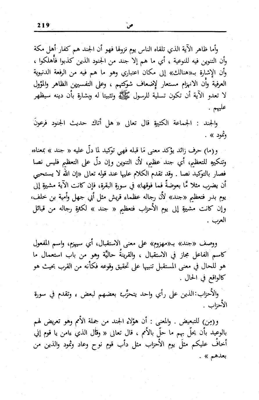 وَمَا حَرْفٌ زَائِدٌ يُؤَكِّدُ مَعْنَى مَا قَبْلَهُ فَهِيَ تَوْكِيدٌ لِمَا دَلَّ عَلَيْهِ جُنْدٌ بِمَعْنَاهُ، وَتَنْكِيرُهُ لِلتَّعْظِيمِ، أَيْ جُنْدٌ عَظِيمٌ، لِأَنَّ التَّنْوِينَ وَإِنْ دَلَّ عَلَى التَّعْظِيمِ فَلَيْسَ نَصًّا فَصَارَ بِالتَّوْكِيدِ نَصًّا. وَقَدْ تَقَدَّمَ الْكَلَامُ عَلَيْهَا عِنْدَ قَوْلِهِ تَعَالَى: إِنَّ اللَّهَ لَا يَسْتَحْيِي أَنْ يَضْرِبَ مَثَلًا مَا بَعُوضَةً فَما فَوْقَها فِي سُورَةِ الْبَقَرَةِ [26] ، فَإِنْ كَانَتِ الْآيَةُ مُشِيرَةً إِلَى يَوْمِ بَدْرٍ فَتَعْظِيمُ جُنْدٌ لِأَنَّ رِجَالَهُ عُظَمَاءُ قُرَيْشٍ مِثْلَ أَبِي جَهْلٍ وَأُمَيَّةَ بْنِ خَلَفٍ، وَإِنْ كَانَتْ مُشِيرَةً إِلَى يَوْمِ الْأَحْزَابِ فَتَعْظِيمُ جُنْدٌ لِكَثْرَةِ رِجَالِهِ مِنْ قَبَائِلِ الْعَرَبِ.