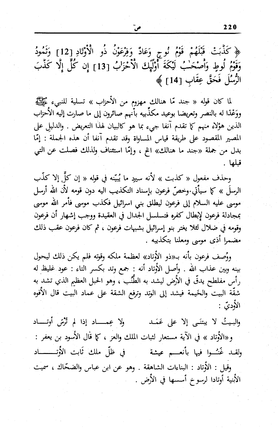 كَذَّبَتْ قَبْلَهُمْ قَوْمُ نُوحٍ وَعادٌ وَفِرْعَوْنُ ذُو الْأَوْتادِ (12) وَثَمُودُ وَقَوْمُ لُوطٍ وَأَصْحابُ الْأَيْكَةِ أُولئِكَ الْأَحْزابُ (13) إِنْ كُلٌّ إِلاَّ كَذَّبَ الرُّسُلَ فَحَقَّ عِقابِ (14)