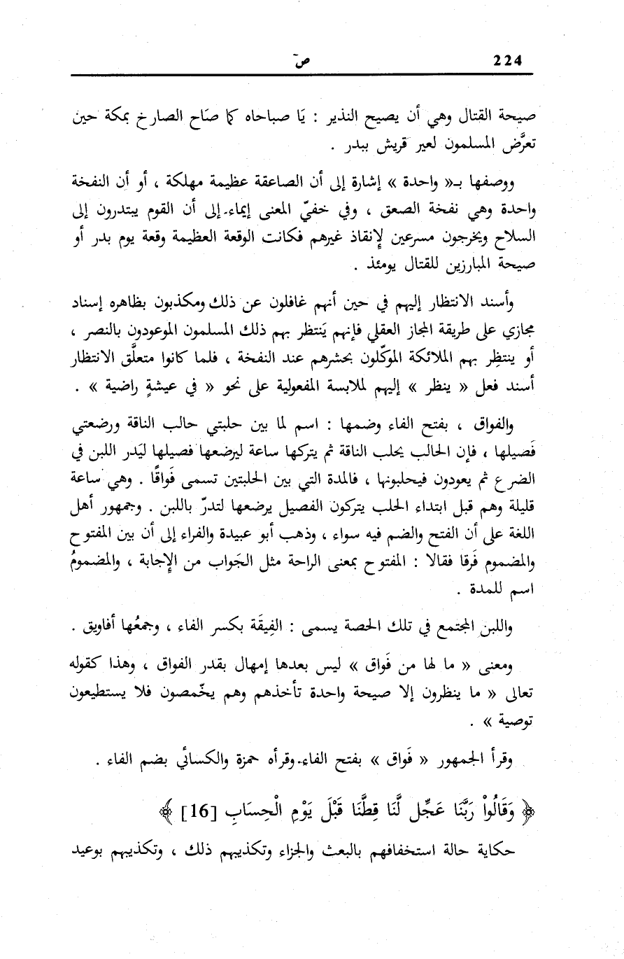 وَمَعْنَى مَا لَها مِنْ فَواقٍ لَيْسَ بَعْدَهَا إِمْهَالٌ بِقَدْرِ الْفَوَاقِ، وَهَذَا كَقَوْلِهِ تَعَالَى: مَا يَنْظُرُونَ إِلَّا صَيْحَةً واحِدَةً تَأْخُذُهُمْ وَهُمْ يَخِصِّمُونَ فَلا يَسْتَطِيعُونَ تَوْصِيَةً [يس: 49، 50] .