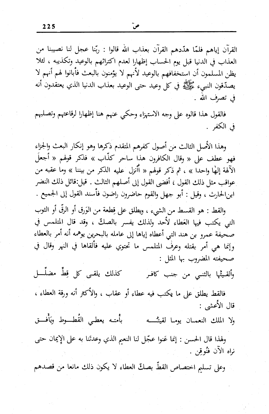 الْقُرْآنِ إِيَّاهُمْ فَلَمَّا هَدَّدَهُمُ الْقُرْآنُ بِعَذَابِ اللَّهِ قَالُوا: رَبَّنَا عَجِّلْ لَنَا نَصِيبَنَا مِنَ الْعَذَابِ فِي الدُّنْيَا قَبْلَ يَوْمِ الْحِسَابِ إِظْهَارًا لِعَدَمِ اكْتِرَاثِهِمْ بِالْوَعِيدِ وَتَكْذِيبِهِ، لِئَلَّا يَظُنَّ الْمُسْلِمُونَ أَنَّ اسْتِخْفَافَهُمْ بِالْوَعِيدِ لِأَنَّهُمْ لَا يُؤْمِنُونَ بِالْبَعْثِ فَأَبَانُوا لَهُمْ أَنَّهُمْ لَا يصدّقون النبيء صَلَّى اللهُ عَلَيْهِ وَسَلَّمَ فِي كُلِّ وَعِيدٍ حَتَّى الْوَعِيدِ بِعَذَابِ الدُّنْيَا الَّذِي يَعْتَقِدُونَ أَنَّهُ فِي تَصَرُّفِ اللَّهِ. فَالْقَوْلُ هَذَا قَالُوهُ عَلَى وَجْهِ الِاسْتِهْزَاءِ وَحُكِيَ عَنْهُمْ هُنَا إِظْهَارًا لِرِقَاعَتِهِمْ وَتَصَلُّبِهِمْ فِي الْكُفْرِ.