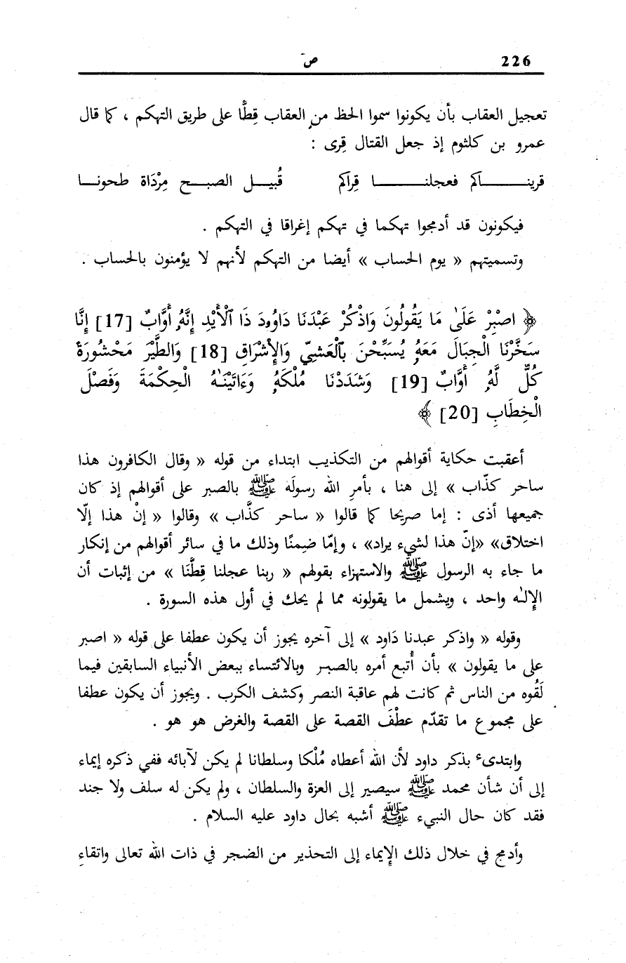 اصْبِرْ عَلى مَا يَقُولُونَ وَاذْكُرْ عَبْدَنا داوُدَ ذَا الْأَيْدِ إِنَّهُ أَوَّابٌ (17) إِنَّا سَخَّرْنَا الْجِبالَ مَعَهُ يُسَبِّحْنَ بِالْعَشِيِّ وَالْإِشْراقِ (18) وَالطَّيْرَ مَحْشُورَةً كُلٌّ لَهُ أَوَّابٌ (19) وَشَدَدْنا مُلْكَهُ وَآتَيْناهُ الْحِكْمَةَ وَفَصْلَ الْخِطابِ (20)
