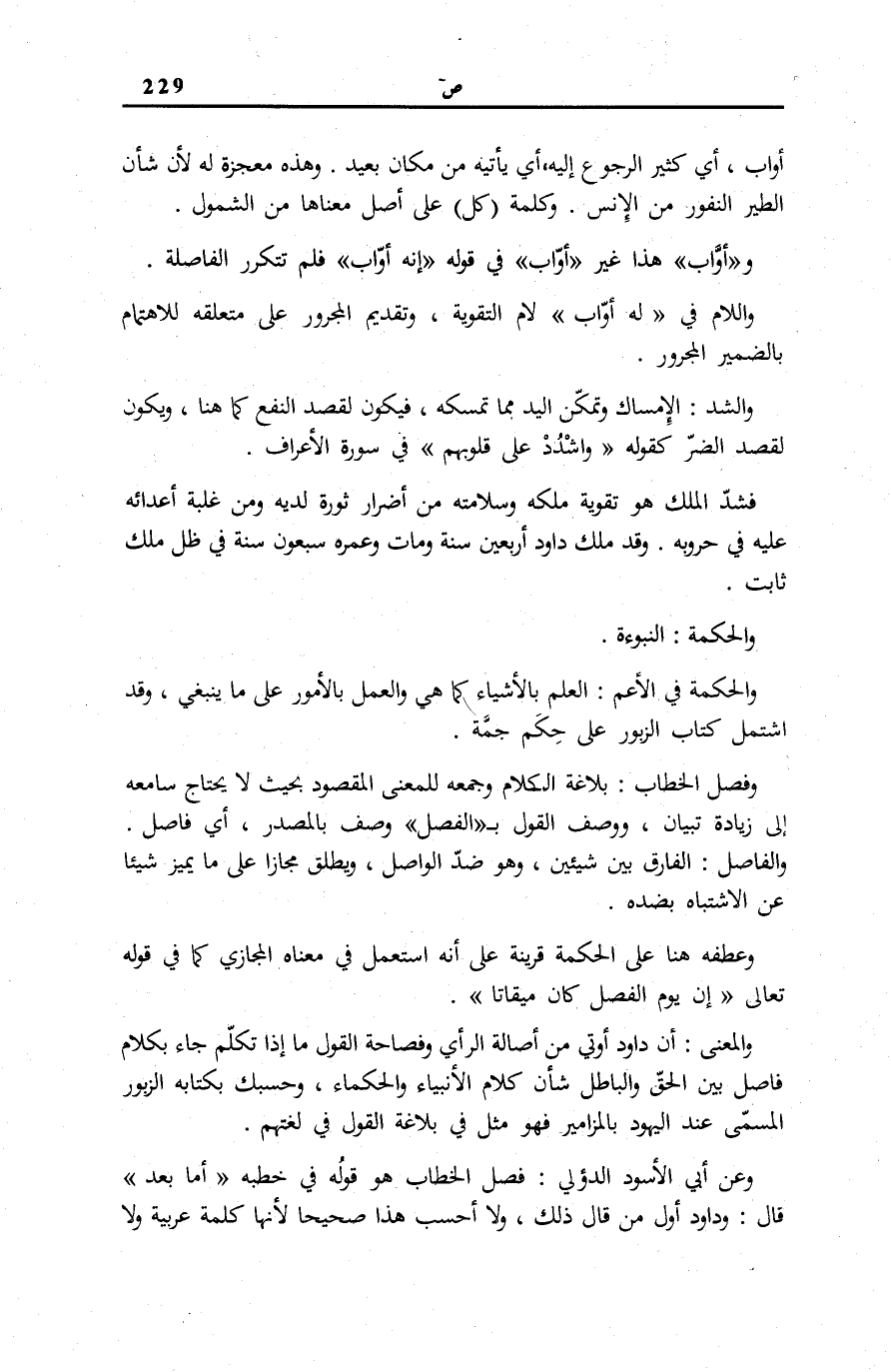وَالْمَعْنَى: أَنَّ دَاوُدَ أُوتِيَ مِنْ أَصَالَةِ الرَّأْيِ وَفَصَاحَةِ الْقَوْلِ مَا إِذَا تَكَلَّمَ جَاءَ بِكَلَامٍ فَاصْلٍ بَيْنَ الْحَقِّ وَالْبَاطِلِ شَأْنُ كَلَامِ الْأَنْبِيَاءِ وَالْحُكَمَاءِ، وَحَسْبُكَ بِكِتَابِهِ «الزَّبُورِ» الْمُسَمَّى عِنْد الْيَهُود ب «المزامير» فَهُوَ مَثَلٌ فِي بَلَاغَةِ الْقَوْلِ فِي لُغَتِهِمْ.