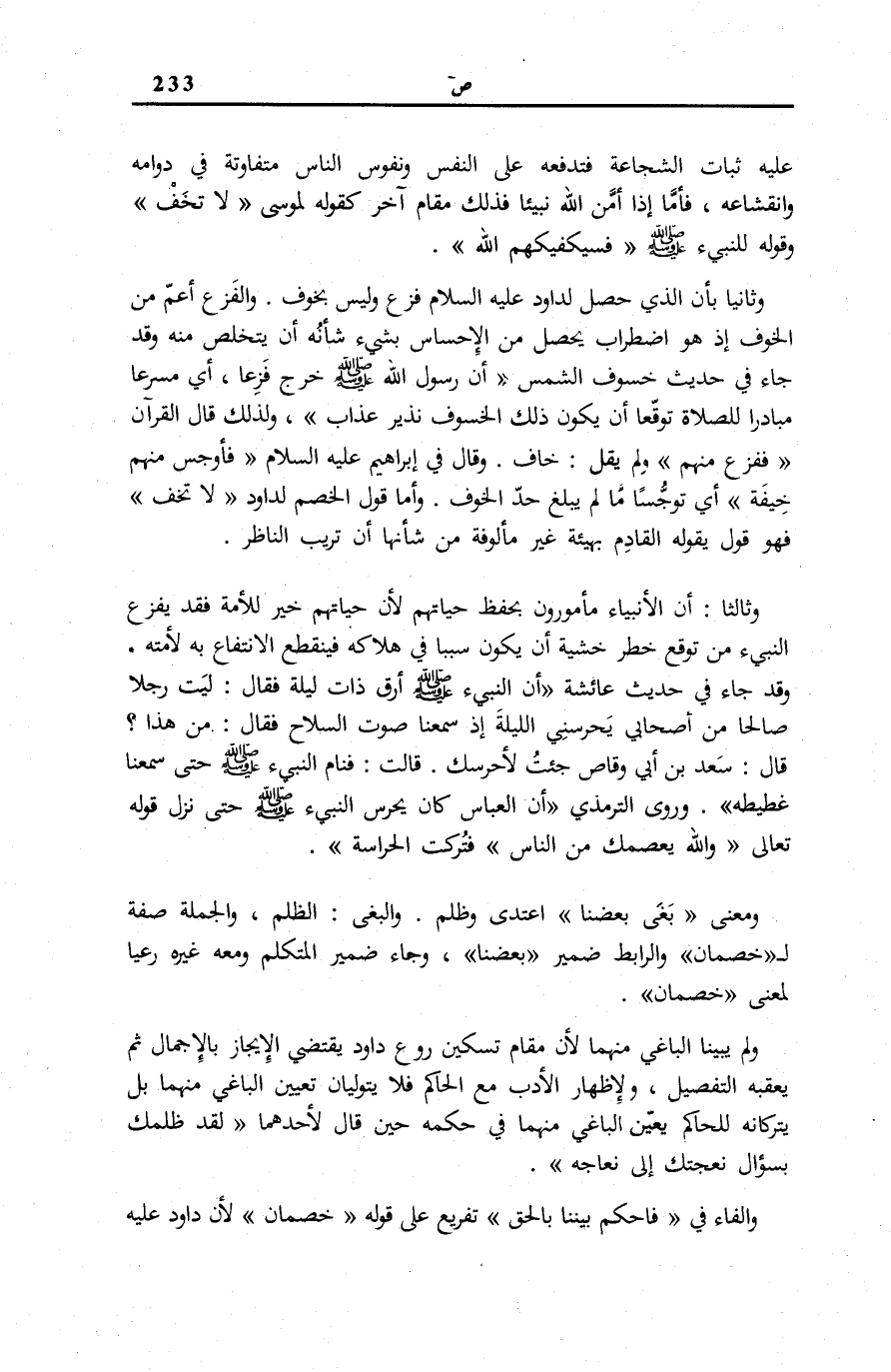 وَقَالَ فِي إِبْرَاهِيمَ عَلَيْهِ السَّلَامُ فَأَوْجَسَ مِنْهُمْ خِيفَةً [الذاريات: 28] أَيْ تَوَجُّسًا مَا لَمْ يَبْلُغْ حَدَّ الْخَوْفِ. وَأَمَّا قَوْلُ الْخَصْمِ لِدَاوُدَ لَا تَخَفْ فَهُوَ قَوْلٌ يَقُولُهُ الْقَادِمُ بِهَيْئَةٍ غَيْرِ مَأْلُوفَةٍ مِنْ شَأْنِهَا أَنْ تُرِيبَ النَّاظِرَ.