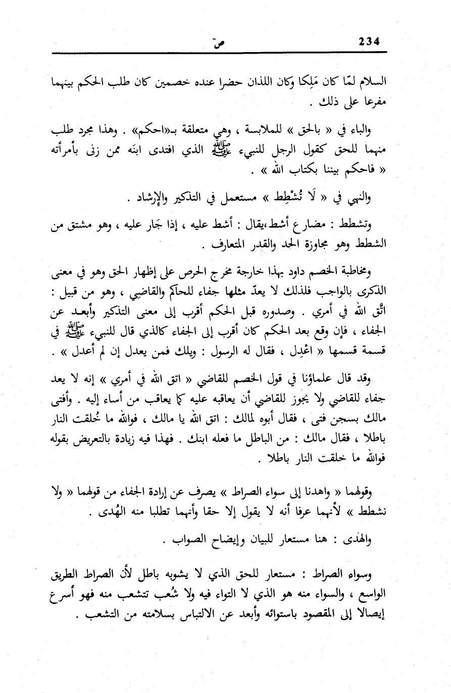 وَمُخَاطَبَةُ الْخَصْمِ دَاوُدَ بِهَذَا خَارِجَةٌ مَخْرَجَ الْحِرْصِ عَلَى إِظْهَارِ الْحَقِّ وَهُوَ فِي مَعْنَى الذِّكْرَى بِالْوَاجِبِ فَلِذَلِكَ لَا يُعَدُّ مِثْلُهَا جَفَاءً لِلْحَاكِمِ وَالْقَاضِي، وَهُوَ مِنْ قَبِيلِ: اتَّقِ اللَّهَ فِي أَمْرِي. وَصُدُورُهُ قَبْلَ الْحُكْمِ أَقْرَبُ إِلَى مَعْنَى التَّذْكِيرِ وَأَبْعَدُ عَنِ الْجَفَاءِ، فَإِنْ وَقَعَ بَعْدَ الْحُكْمِ كَانَ أَقْرَبَ إِلَى الْجَفَاءِ كَالَّذِي