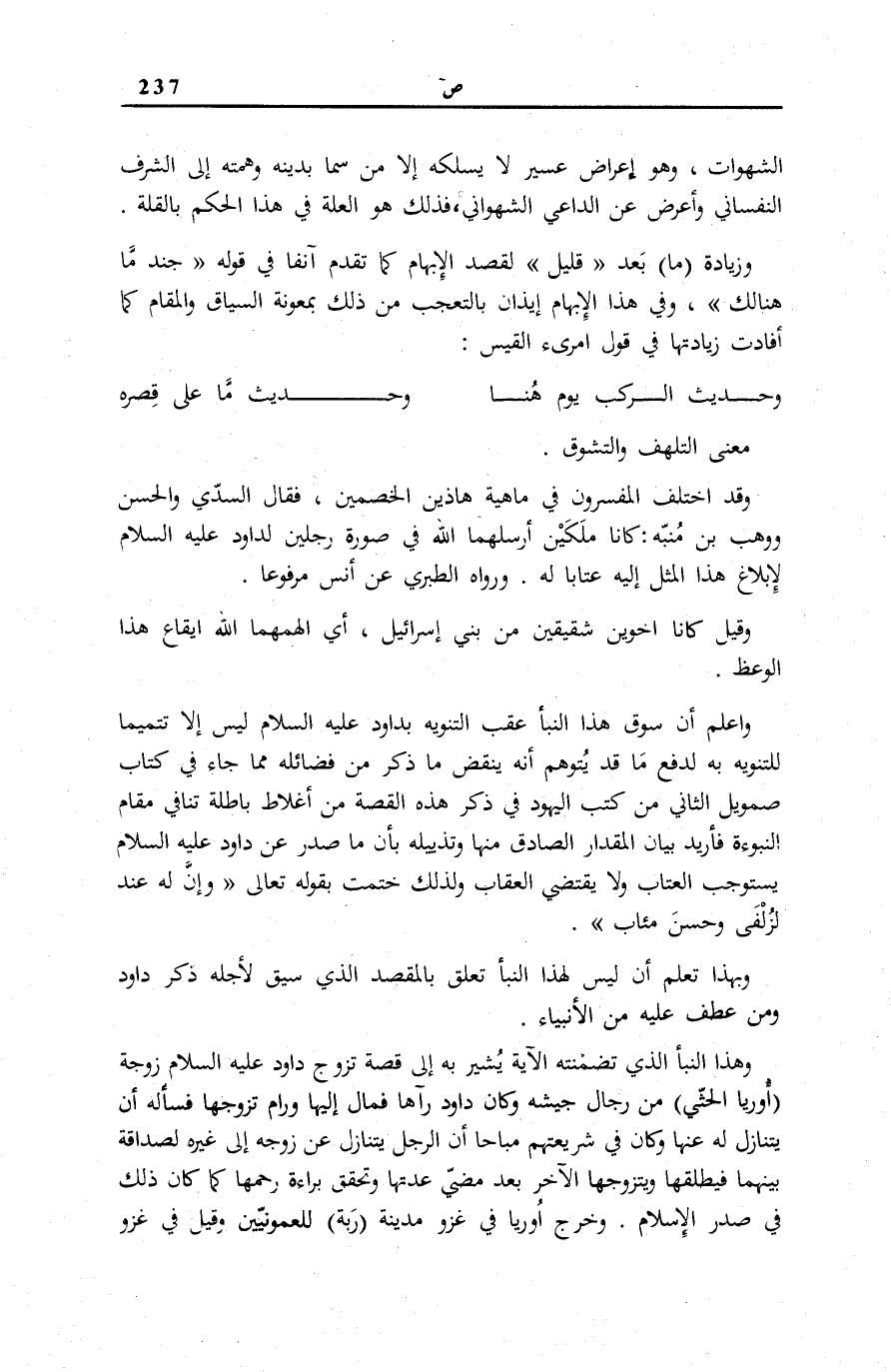 وَهَذَا النَّبَأُ الَّذِي تَضَمَّنَتْهُ الْآيَةُ يُشِيرُ بِهِ إِلَى قِصَّةِ تَزَوُّجِ دَاوُدَ عَلَيْهِ السَّلَامُ زَوْجَةَ (أُورَيَا الْحَثِّيِّ) مِنْ رِجَالِ جَيْشِهِ وَكَانَ دَاوُدُ رَآهَا فَمَالَ إِلَيْهَا وَرَامَ تَزَوُّجَهَا فَسَأَلَهُ أَنْ يَتَنَازَلَ لَهُ عَنْهَا وَكَانَ فِي شَرِيعَتِهِمْ مُبَاحًا أَنَّ الرَّجُلَ يَتَنَازَلُ عَنْ زَوْجِهِ إِلَى غَيْرِهِ لِصَدَاقَةٍ بَيْنَهُمَا فَيُطَلِّقُهَا وَيَتَزَوَّجُهَا الْآخَرُ بَعْدَ مُضِيِّ عِدَّتِهَا وَتَحَقُّقِ بَرَاءَةِ رَحِمِهَا كَمَا كَانَ ذَلِكَ فِي صَدْرِ الْإِسْلَامِ.