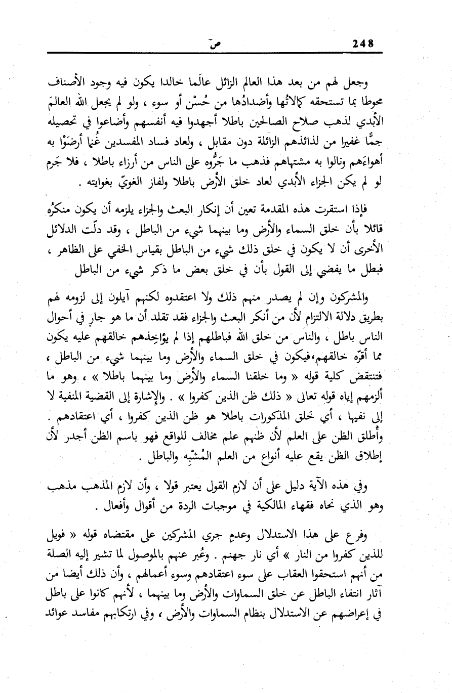 دَلَالَةِ الِالْتِزَامِ لِأَنَّ مَنْ أَنْكَرَ الْبَعْثَ وَالْجَزَاءَ فَقَدْ تَقَلَّدَ أَنَّ مَا هُوَ جَارٍ فِي أَحْوَالِ النَّاسِ بَاطِلٌ، وَالنَّاسُ مِنْ خَلْقِ اللَّهِ فَبَاطِلُهُمْ إِذَا لَمْ يُؤَاخِذْهُمْ خَالِقُهُمْ عَلَيْهِ يَكُونُ مِمَّا أَقَرَّهُ خَالِقُهُمْ، فَيَكُونُ فِي خَلْقِ السَّمَاءِ وَالْأَرْضِ وَمَا بَيْنَهُمَا شَيْءٌ مِنَ الْبَاطِلِ، فَتَنْتَقِضُ كُلِّيَّةُ قَوْلِهِ: وَما خَلَقْنَا السَّماءَ وَالْأَرْضَ وَما بَيْنَهُما باطِلًا، وَهُوَ مَا أَلْزَمَهُمْ إِيَّاهُ قَوْلُهُ تَعَالَى: ذلِكَ ظَنُّ الَّذِينَ كَفَرُوا. وَالْإِشَارَةُ إِلَى الْقَضِيَّةِ الْمَنْفِيَّةِ لَا إِلَى نَفْيِهَا، أَيْ خَلْقُ الْمَذْكُورَاتِ بَاطِلًا هُوَ ظَنُّ الَّذِينَ كَفَرُوا، أَيِ اعْتِقَادُهُمْ. وَأُطْلِقَ الظَّنُّ عَلَى الْعِلْمِ لِأَنَّ ظَنَّهُمْ عِلْمٌ مُخَالِفٌ لِلْوَاقِعِ فَهُوَ بَاسْمِ الظَّنِّ أَجْدَرُ لِأَنَّ إِطْلَاقَ الظَّنِّ يَقَعُ عَلَيْهِ أَنْوَاعٌ مِنَ الْعِلْمِ الْمُشْبِهِ وَالْبَاطِلِ. وَفِي هَذِهِ الْآيَةِ دَلِيلٌ عَلَى أَنَّ لَازِمَ الْقَوْلِ يُعْتَبَرُ قَوْلًا، وَأَنَّ لَازِمَ الْمَذْهَبِ مَذْهَبٌ وَهُوَ الَّذِي نَحَاهُ فُقَهَاءُ الْمَالِكِيَّةِ فِي مُوجِبَاتِ الرِّدَّةِ مِنْ أَقْوَالٍ وَأَفْعَالٍ.
