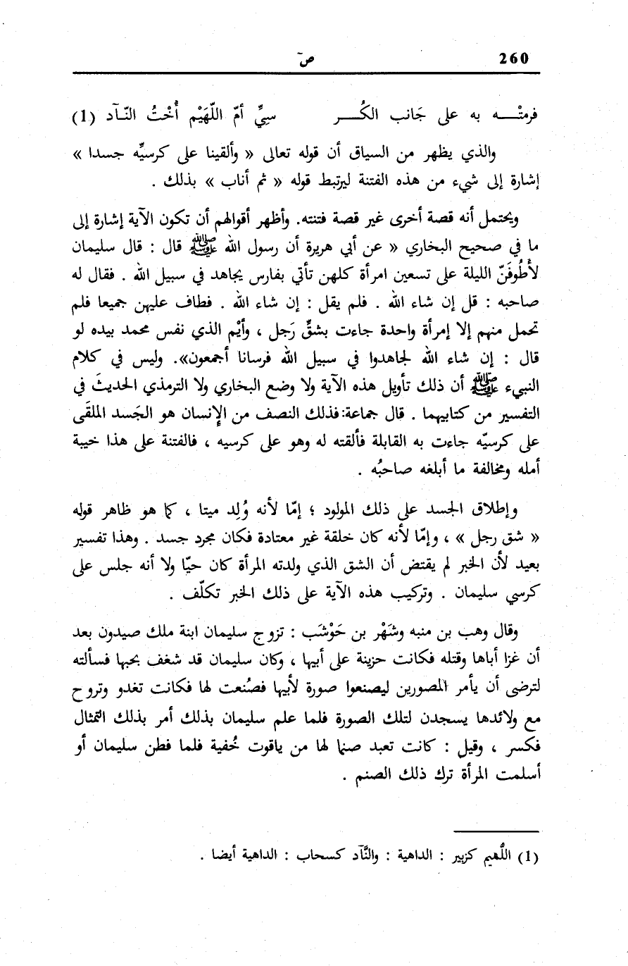 وَإِطْلَاقُ الْجَسَدِ عَلَى ذَلِكَ الْمَوْلُودِ إِمَّا لِأَنَّهُ وُلِدَ مَيِّتًا، كَمَا هُوَ ظَاهِرُ قَوْلِهِ: «شِقِّ رَجُلٍ» ، وَإِمَّا لِأَنَّهُ كَانَ خِلْقَةً غَيْرَ مُعْتَادَةٍ فَكَانَ مُجَرَّدَ جَسَدٍ. وَهَذَا تَفْسِيرٌ بَعِيدٌ لِأَنَّ الْخَبَرَ لَمْ يَقْتَضِ أَنَّ الشِّقَّ الَّذِي وَلَدَتْهُ الْمَرْأَةُ كَانَ حَيًّا وَلَا أَنَّهُ جَلَسَ عَلَى كُرْسِيِّ سُلَيْمَانَ. وَتَرْكِيبُ هَذِهِ الْآيَةِ عَلَى ذَلِكَ الْخَبَرِ تَكَلُّفٌ.