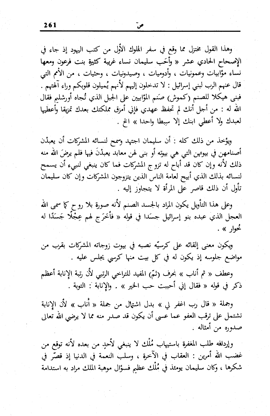وَهَذَا الْقَوْلُ مُخْتَزَلٌ مِمَّا وَقَعَ فِي «سِفْرِ الْمُلُوكِ» الْأَوَّلِ مِنْ كُتُبٍ الْيَهُودِ إِذْ جَاءَ فِي الْإِصْحَاحِ الْحَادِي عَشَرَ: وَأَحَبَّ سُلَيْمَانُ نِسَاءً غَرِيبَةً كُثَيْرَةَ بِنْتَ فِرْعَوْنَ وَمَعَهَا نِسَاءٌ مُؤَابَيَاتٌ وَعَمُونِيَّاتٌ، وَأَدُومِيَّاتٌ وَصَيْدَوَنِيَّاتٌ وَحَثَيَاتٌ مِنَ الْأُمَمِ الَّتِي قَالَ عَنْهُمُ الرَّبُّ لِبَنِي إِسْرَائِيلَ: لَا تَدْخُلُونَ إِلَيْهِمْ لِأَنَّهُمْ يُمِيلُونَ قُلُوبَكُمْ وَرَاءَ آلِهَتِهِمْ. فَبَنَى هَيْكَلًا لِلصَّنَمِ (كَمُوشَ) صَنَمِ الْمُؤَابِيِّينَ عَلَى الْجَبَلِ الَّذِي تُجَاهَ أُورْشَلِيمَ فَقَالَ اللَّهُ لَهُ: مِنْ أَجْلِ أَنَّكَ لَمْ تَحْفَظْ عَهْدِي فَإِنِّي أُمَزِّقُ مَمْلَكَتَكَ بَعْدَكَ تَمْزِيقًا وَأُعْطِيهَا لِعَبْدِكَ وَلَا أُعْطِي ابْنَكَ إِلَّا سِبْطًا وَاحِدًا إِلَخْ.