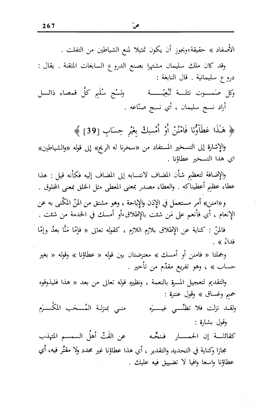 هَذَا عَطاؤُنا فَامْنُنْ أَوْ أَمْسِكْ بِغَيْرِ حِسابٍ (39)