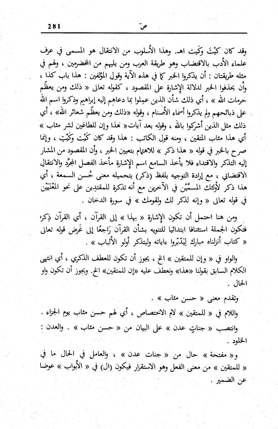 وَقَدْ كَانَ كَيْتَ وَكَيْتَ اه. وَهَذَا الْأُسْلُوبُ مِنَ الِانْتِقَالِ هُوَ الْمُسَمَّى فِي عُرْفِ عُلَمَاءِ الْأَدَبِ بِالِاقْتِضَابِ وَهُوَ طَرِيقَةُ الْعَرَبِ وَمَنْ يَلِيهِمْ مِنَ الْمُخَضْرَمِينَ، وَلَهُمْ فِي مِثْلِهِ طَرِيقَتَانِ: أَنْ يَذْكُرُوا الْخَبَرَ كَمَا فِي هَذِهِ الْآيَةِ وَقَوْلِ الْمُؤَلِّفِينَ: هَذَا بَابُ كَذَا، وَأَنْ يَحْذِفُوا الْخَبَرَ لِدَلَالَةِ الْإِشَارَةِ عَلَى الْمَقْصُودِ، كَقَوْلِهِ تَعَالَى: ذلِكَ وَمَنْ يُعَظِّمْ حُرُماتِ اللَّهِ [الْحَج: 30] ، أَيْ ذَلِك شَأْن الَّذِي عَمِلُوا بِمَا دَعَاهُمْ إِلَيْهِ إِبْرَاهِيمُ وَذَكَرُوا اسْمَ اللَّهِ عَلَى ذَبَائِحِهِمْ وَلَمْ يَذْكُرُوا أَسْمَاءَ الْأَصْنَامِ، وَقَوْلِهِ: ذلِكَ وَمَنْ يُعَظِّمْ شَعائِرَ اللَّهِ، أَيْ ذَلِكَ مَثَلُ الَّذِينَ أَشْرَكُوا بِاللَّهِ، وَقَولِهِ بَعْدَ آيَاتٍ هَذَا وَإِنَّ لِلطَّاغِينَ لَشَرَّ مَآبٍ [ص: 55] أَيْ هَذَا مَآبُ الْمُتَّقِينَ، وَمِنْهُ قَولُ الْكَاتِبِ: هَذَا وَقَدْ كَانَ كَيْتَ وَكَيْتَ، وَإِنَّمَا صُرِّحَ بِالْخَبَرِ فِي قَوْلِهِ: هَذَا ذِكْرٌ لِلِاهْتِمَامِ بِتَعْيِينِ الْخَبَرِ، وَأَنَّ الْمَقْصُودَ مِنَ الْمُشَارِ إِلَيْهِ التَّذَكُّرُ وَالِاقْتِدَاءُ فَلَا يَأْخُذُ السَّامِعُ اسْمَ الْإِشَارَةِ مَأْخَذَ الْفَصْلِ الْمُجَرَّدِ وَالِانْتِقَالِ الِاقْتِضَابِيِّ، مَعَ إِرَادَةِ التَّوْجِيهِ بِلَفْظِ ذِكْرٌ بِتَحْمِيلِهِ مَعْنَى حُسْنِ السمعة، أَي هَذَا ذِكْرٌ لِأُولَئِكَ الْمُسَمَّيْنَ فِي الْآخَرِينَ مَعَ أَنَّهُ تَذْكِرَةٌ لِلْمُقْتَدِينَ عَلَى نَحْوِ الْمَعْنَيَيْنِ فِي قَوْلِهِ تَعَالَى: وَإِنَّهُ لَذِكْرٌ لَكَ وَلِقَوْمِكَ فِي سُورَة الدُّخان [الزُّخْرُفِ: 44] .