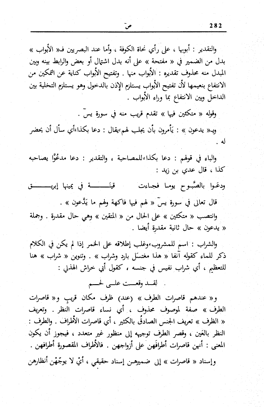 لَقَدْ وَقَعْتُ عَلَى لَحْمٍ وعِنْدَهُمْ قاصِراتُ الطَّرْفِ: عِنْدَ ظَرْفُ مَكَانٍ قَرِيبٍ وقاصِراتُ الطَّرْفِ صِفَةٌ لِمَوْصُوفٍ مَحْذُوفٍ، أَيْ نِسَاءٌ قَاصِرَاتُ النَّظَرِ. وَتَعْرِيفُ الطَّرْفِ تَعْرِيفُ الْجِنْسِ الصَّادِقِ بِالْكَثِيرِ، أَيْ قَاصِرَاتُ الْأَطْرَافِ. والطَّرْفِ: النَّظَرُ بِالْعَيْنِ، وَقَصْرُ الطَّرْفِ تَوْجِيهَهٌ إِلَى مَنْظُورٍ غَيْرِ مُتَعَدِّدٍ، فَيَجُوزُ أَنْ يَكُونَ الْمَعْنَى: أَنَّهُنَ قَاصِرَاتٌ أَطْرَافَهُنَّ عَلَى أَزْوَاجِهِنَّ. فَالْأَطْرَافُ الْمَقْصُورَةُ أَطْرَافُهُنَّ. وَإِسْنَادُ قاصِراتُ إِلَى ضميرهن إِسْنَادٌ