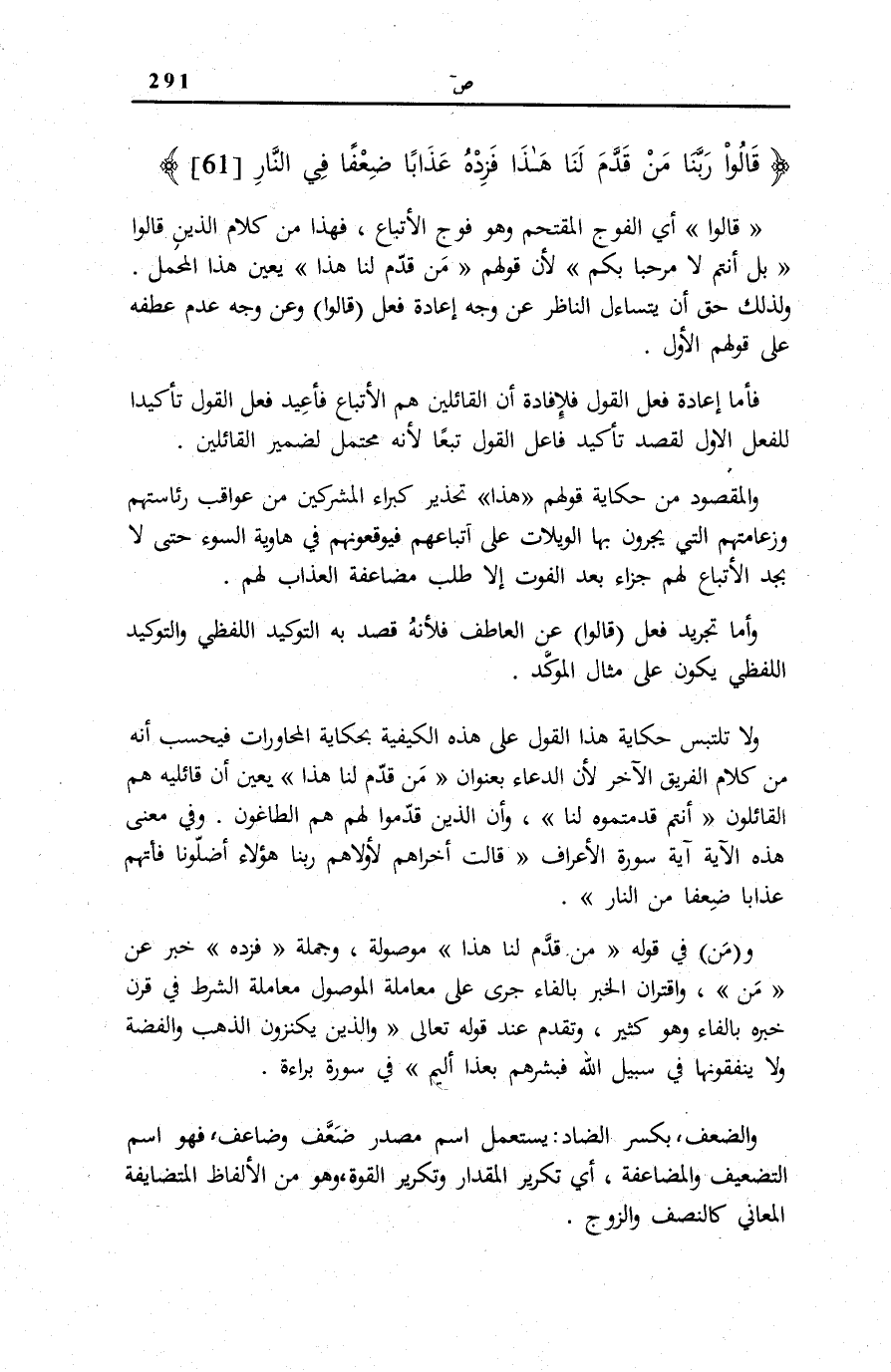 وَلَا تَلْتَبِسُ حِكَايَةُ هَذَا الْقَوْلِ عَلَى هَذِهِ الْكَيْفِيَّةِ بِحِكَايَةِ الْمُحَاوَرَاتِ فَيُحْسَبُ أَنَّهُ مِنْ كَلَامِ الْفَرِيقِ الْآخَرِ لِأَنَّ الدُّعَاءَ بِعُنْوَانِ مَنْ قَدَّمَ لَنا هَذَا يُعَينُ أَنَّ قَائِلِيهِ هُمُ الْقَائِلُونَ أَنْتُمْ قَدَّمْتُمُوهُ لَنا [ص: 60] ، وَأَنَّ الَّذِينَ قَدَّمُوا لَهُمْ هُمُ الطَّاغُونَ. وَفِي مَعْنَى هَذِهِ الْآيَةِ آيَةُ سُورَةِ الْأَعْرَافِ [38] قالَتْ أُخْراهُمْ لِأُولاهُمْ رَبَّنا هؤُلاءِ أَضَلُّونا فَآتِهِمْ عَذاباً ضِعْفاً مِنَ النَّارِ.