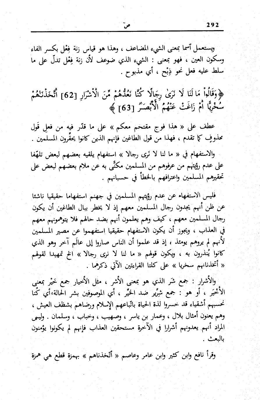والْأَشْرارِ: جَمْعُ شَرٍّ الَّذِي هُوَ بِمَعْنَى الْأَشِرِّ، مِثْلُ الْأَخْيَارِ جَمْعُ خَيْرٍ بِمَعْنَى الْأَخْيَرِ، أَوْ هُوَ: جَمْعُ شِرِّيرٍ ضِدُّ الخيّر، أَي الموصوفين بِشَرِّ الْحَالَةِ، أَيْ كُنَّا نَحْسَبُهُمْ أَشْقِيَاءَ قَدْ خَسِرُوا لَذَّةَ الْحَيَاةِ بِاتِّبَاعِهِمُ الْإِسْلَامَ وَرِضَاهُمْ بِشَظَفِ الْعَيْشِ، وَهُمْ يَعْنُونَ أَمْثَالَ بِلَالٍ، وَعَمَّارِ بْنِ يَاسِرٍ، وَصُهَيْبٍ، وَخِبَابٍ، وَسَلْمَانَ. وَلَيْسَ الْمُرَادُ أَنَّهُمْ يَعُدُّونَهُمْ أَشْرَارًا فِي الْآخِرَةِ مُسْتَحِقِّينَ الْعَذَابَ فَإِنَّهُمْ لَمْ يَكُونُوا يُؤْمِنُونَ بِالْبَعْثِ.
