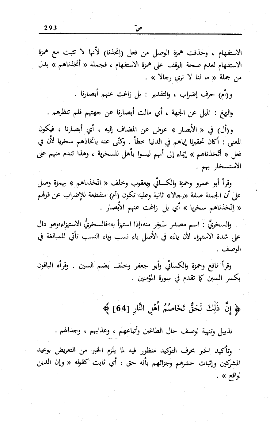 وَ (الْ) فِي الْأَبْصارُ عِوَضٌ عَنِ الْمُضَافِ إِلَيْهِ، أَيْ أَبْصَارُنَا، فَيَكُونُ الْمَعْنَى: أَكَانَ تَحْقِيرُنَا إِيَّاهُمْ فِي الدُّنْيَا خَطَأٌ. وَكُنِّيَ عَنْهُ بِاتِّخَاذِهِمْ سُخْرِيًّا لِأَنَّ فِي فِعْلِ أَتَّخَذْناهُمْ إِيمَاءٌ إِلَى أَنَّهُمْ لَيْسُوا بِأَهْلٍ لِلسُّخْرِيَةِ، وَهَذَا تَنَدُّمٌ مِنْهُمْ عَلَى الِاسْتِسْخَارِ بِهِمْ.