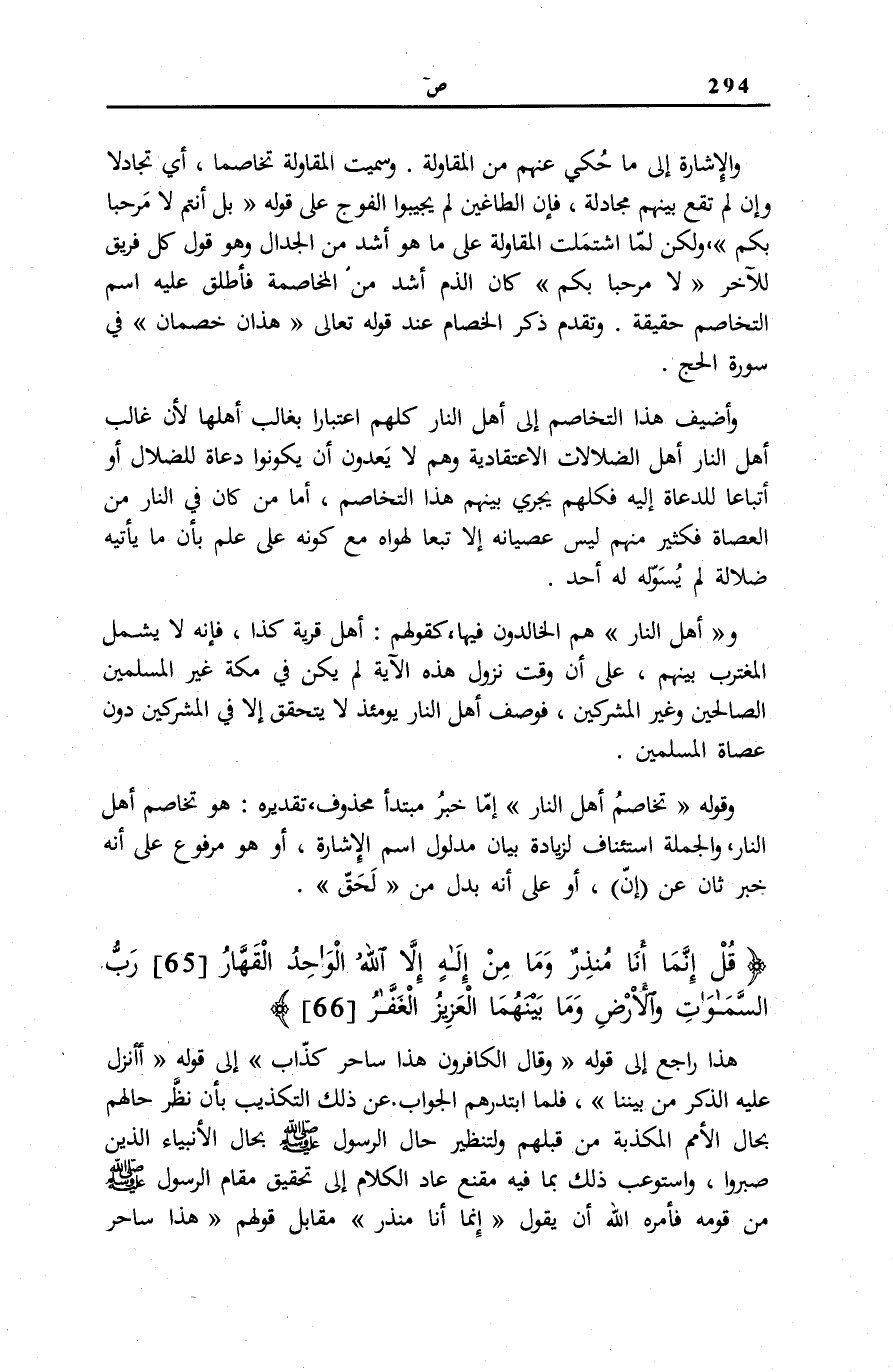 وأَهْلِ النَّارِ هُمُ الْخَالدُونَ فِيهَا، كَقَوْلِهِمْ: أَهَّلُ قَرْيَةِ كَذَا، فَإِنَّهُ لَا يَشْمَلُ الْمُغْتَرِبَ بَيْنَهُمْ، عَلَى أَنَّ وَقْتَ نُزُولِ هَذِهِ الْآيَةِ لَمْ يَكُنْ فِي مَكَّةِ غَيْرُ الْمُسْلِمِينَ الصَّالِحِينَ وَغَيْرُ الْمُشْرِكِينَ، فَوَصْفُ أَهْلِ النَّارِ يَوْمَئِذٍ لَا يَتَحَقَّقُ إِلَّا فِي الْمُشْرِكِينَ دُونَ عُصَاةَ الْمُسْلِمِينَ. وَقَوْلُهُ: تَخاصُمُ أَهْلِ النَّارِ إِمَّا خَبَرُ مُبْتَدَأٍ مَحْذُوفٍ، تَقْدِيرُهُ: هُوَ تُخَاصُمُ أَهْلِ النَّارِ، وَالْجُمْلَةُ اسْتِئْنَافٌ لِزِيَادَةِ بَيَانِ مَدْلُولِ اسْمِ الْإِشَارَةِ، أَوْ هُوَ مَرْفُوعٌ عَلَى أَنَّهُ خَبَرٌ ثَانٍ عَنْ إِنَّ، أَوْ عَلَى أَنَّهُ بَدَلٌ من لَحَقٌّ.