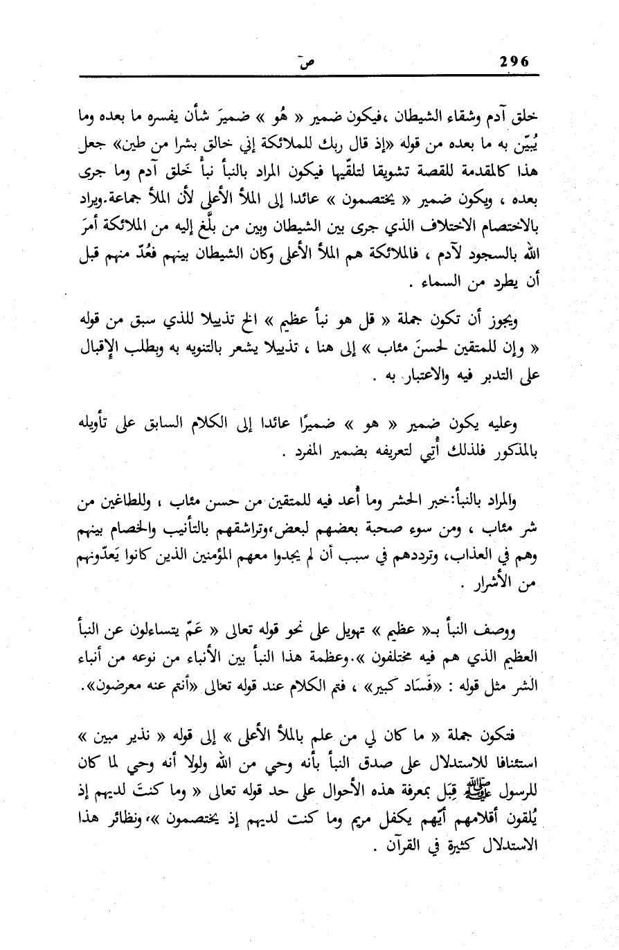 فَتَكُونُ جُمْلَةُ مَا كانَ لِي مِنْ عِلْمٍ بِالْمَلَإِ الْأَعْلى إِلَى قَوْلِهِ: نَذِيرٌ مُبِينٌ اسْتِئْنَافًا لِلِاسْتِدْلَالِ عَلَى صِدْقِ النَّبَأِ بِأَنَّهُ وَحْيٌ مِنَ اللَّهِ وَلَوْلَا أَنَّهُ وَحْيٌ لَمَا كَانَ للرسول صَلَّى اللهُ عَلَيْهِ وَسَلَّمَ قِبَلٌ بِمَعْرِفَةِ هَذِهِ الْأَحْوَالِ عَلَى حَدِّ قَوْلِهِ تَعَالَى: وَما كُنْتَ لَدَيْهِمْ إِذْ يُلْقُونَ أَقْلامَهُمْ أَيُّهُمْ يَكْفُلُ مَرْيَمَ وَما كُنْتَ لَدَيْهِمْ إِذْ يَخْتَصِمُونَ [آل عمرَان: 44] ، وَنَظَائِرُ هَذَا الِاسْتِدْلَالِ كَثِيرَةٌ فِي الْقُرْآنِ.