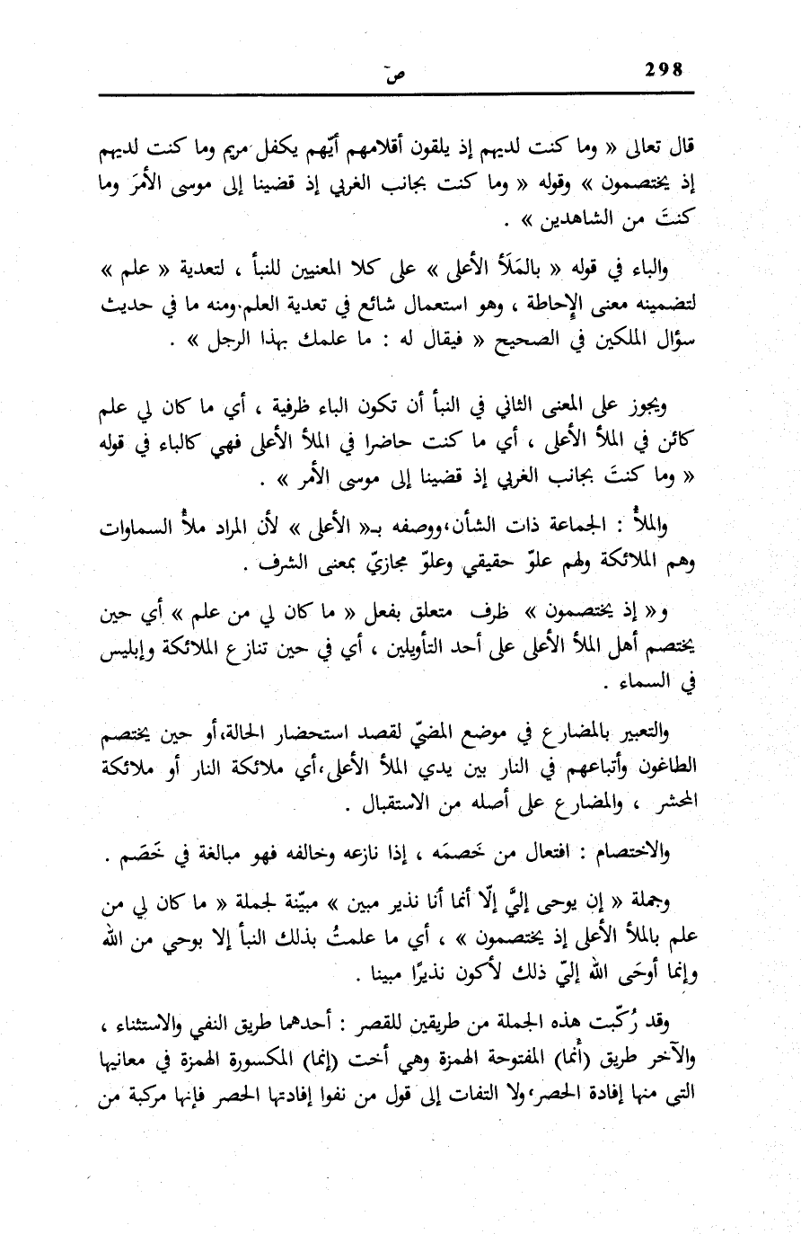 وَالْبَاءُ فِي قَوْلِهِ: بِالْمَلَإِ الْأَعْلى عَلَى كِلَا الْمَعْنَيَيْنِ لِلنَّبَأِ، لِتَعْدِيَةِ عِلْمٍ لِتَضْمِينِهِ مَعْنَى الْإِحَاطَةِ، وَهُوَ اسْتِعْمَالٌ شَائِعٌ فِي تَعْدِيَةِ الْعِلْمِ. وَمِنْهُ مَا فِي حَدِيثِ سُؤَالِ الْمَلَكَيْنِ فِي «الصَّحِيحِ» فَيُقَالُ لَهُ: مَا عِلْمُكَ بِهَذَا الرَّجُلِ. وَيَجُوزُ عَلَى الْمَعْنَى الثَّانِي فِي النَّبَأِ أَنْ تَكُونَ الْبَاءُ ظَرْفِيَّةً، أَيْ مَا كَانَ لِي عِلْمٌ كَائِنٌ فِي الْمَلَأِ الْأَعْلَى، أَيْ مَا كُنْتَ حَاضِرًا فِي الْمَلَأِ الْأَعْلَى فَهِيَ كَالْبَاءِ فِي قَوْلِهِ: وَما كُنْتَ بِجانِبِ الْغَرْبِيِّ إِذْ قَضَيْنا إِلى مُوسَى الْأَمْرَ [الْقَصَص: 44] .