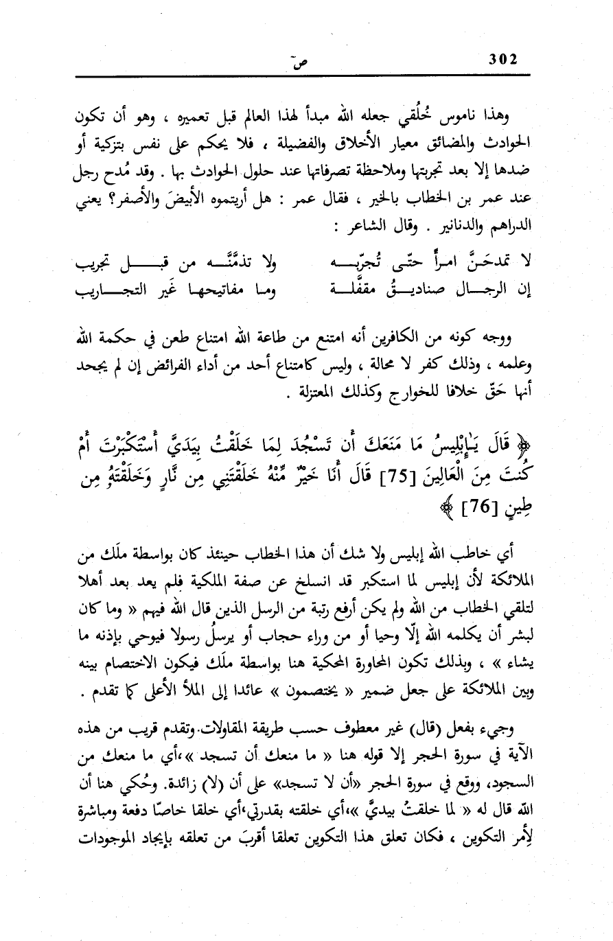 وَجِيءَ بِفِعْلِ قالَ غَيْرَ مَعْطُوفٍ حَسْبَ طَرِيقَةِ الْمُقَاوَلَاتِ. وَتَقَدَّمَ قَرِيبٌ مِنْ هَذِهِ الْآيَةِ فِي سُورَةِ الْحِجْرِ إِلَّا قَوْلَهُ هُنَا مَا مَنَعَكَ أَنْ تَسْجُدَ، أَيْ مَا مَنَعَكَ مِنَ السُّجُودِ، وَوَقَعَ فِي سُورَة [الْأَعْرَاف: 12] أَلَّا تَسْجُدَ عَلَى أَنْ لَا زَائِدَةً. وَحُكِيَ هُنَا أَنَّ اللَّهَ قَالَ لَهُ: لِما خَلَقْتُ بِيَدَيَّ، أَيْ خَلَقْتُهُ بِقُدْرَتِي، أَيْ خَلْقًا خَاصًّا دَفْعَةً وَمُبَاشَرَةً لِأَمْرِ التَّكْوِينِ، فَكَانَ تَعَلُّقُ هَذَا التكوين تعلقا أَقْرَبَ مَنْ تَعَلُّقِهِ بِإِيجَادِ الْمَوْجُودَاتِ