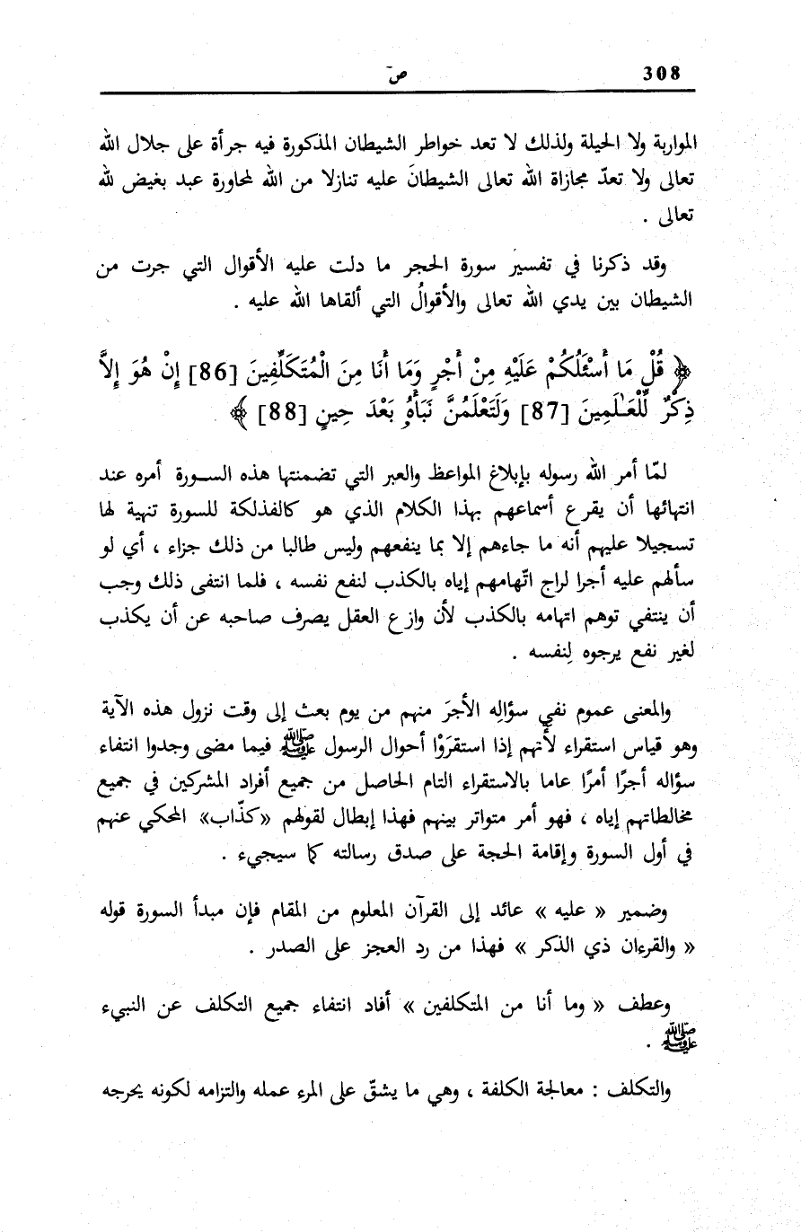 قُلْ مَا أَسْئَلُكُمْ عَلَيْهِ مِنْ أَجْرٍ وَما أَنَا مِنَ الْمُتَكَلِّفِينَ (86) إِنْ هُوَ إِلاَّ ذِكْرٌ لِلْعالَمِينَ (87) وَلَتَعْلَمُنَّ نَبَأَهُ بَعْدَ حِينٍ (88)