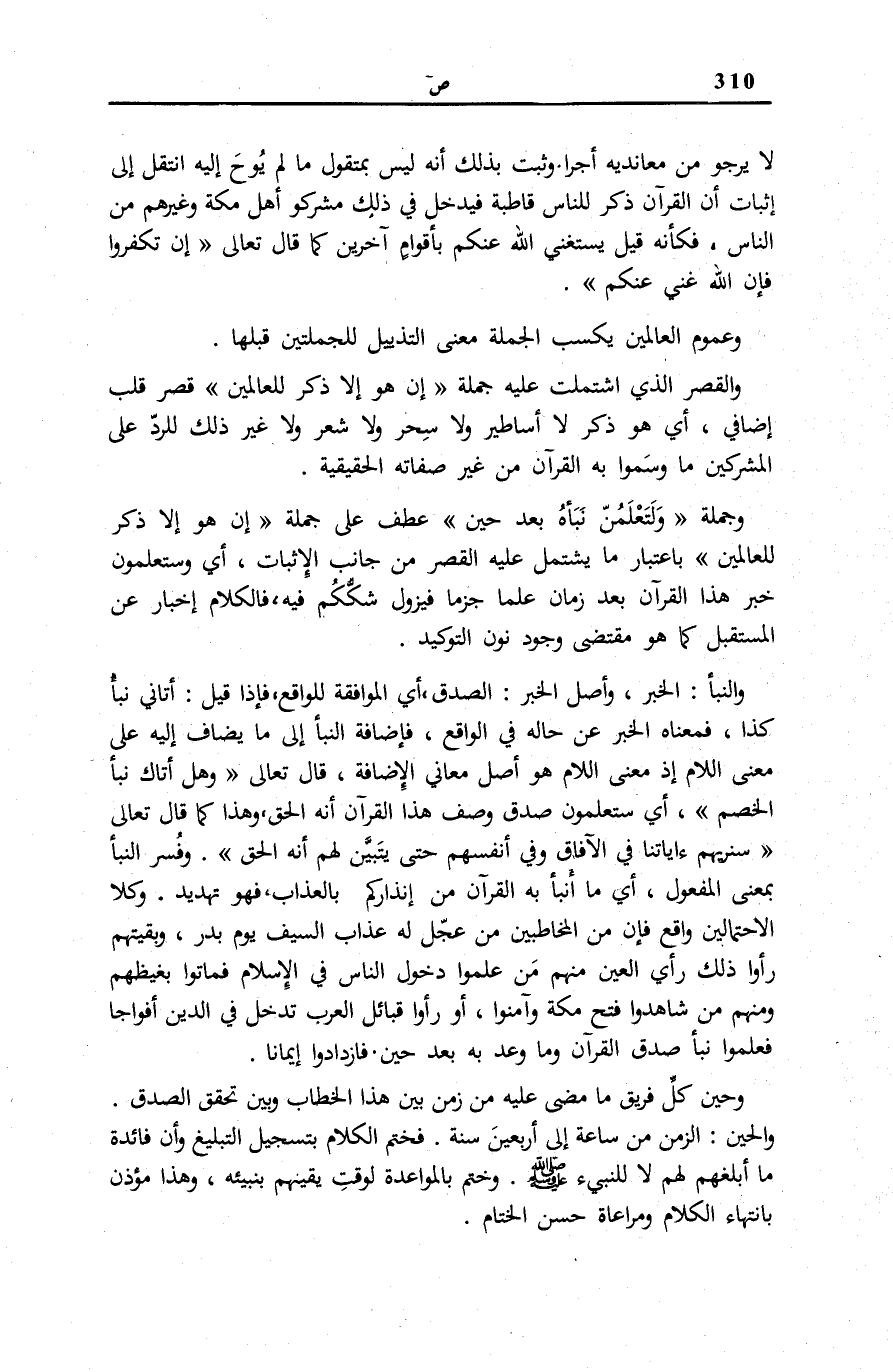 وَجُمْلَةُ وَلَتَعْلَمُنَّ نَبَأَهُ بَعْدَ حِينٍ عَطْفٌ عَلَى جُمْلَةِ إِنْ هُوَ إِلَّا ذِكْرٌ لِلْعالَمِينَ بِاعْتِبَارِ مَا يَشْتَمِلُ عَلَيْهِ الْقَصْرُ مِنْ جَانِبِ الْإِثْبَاتِ، أَيْ وَسَتَعْلَمُونَ خَبَرَ هَذَا الْقُرْآنِ بَعْدَ زَمَانٍ عِلْمًا جَزْمًا فَيَزُولُ شَكُّكُمْ فِيهِ، فَالْكَلَامُ إِخْبَارٌ عَنِ الْمُسْتَقْبَلِ كَمَا هُوَ مُقْتَضَى وُجُودِ نُونِ التَّوْكِيدِ.