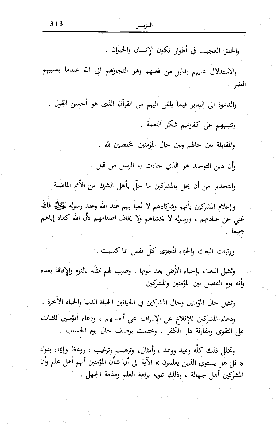 وَالْخَلْقِ الْعَجِيبِ فِي أطوار تكون الْإِنْسَانِ وَالْحَيَوَانِ. وَالِاسْتِدْلَالِ عَلَيْهِمْ بِدَلِيلٍ مِنْ فِعْلِهِمْ وَهُوَ الْتِجَاؤُهُمْ إِلَى الله عِنْد مَا يُصِيبُهُمُ الضُّرُّ. وَالدَّعْوَةِ إِلَى التَّدَبُّرِ فِيمَا يُلْقَى إِلَيْهِمْ مِنَ الْقُرْآنِ الَّذِي هُوَ أَحْسَنُ الْقَوْلِ. وَتَنْبِيهِهِمْ عَلَى كُفْرَانِهِمْ شُكْرَ النِّعْمَةِ. وَالْمُقَابَلَةِ بَيْنَ حَالِهِمْ وَبَيْنَ حَالِ الْمُؤْمِنِينَ الْمُخْلِصِينَ لِلَّهِ. وَأَنَّ دِينَ التَّوْحِيدِ هُوَ الَّذِي جَاءَتْ بِهِ الرُّسُلُ مِنْ قَبْلُ. وَالتَّحْذِيرِ مِنْ أَنْ يَحِلَّ بِالْمُشْرِكِينَ مَا حَلَّ بِأَهْلِ الشِّرْكِ مِنَ الْأُمَمِ الْمَاضِيَةِ. وَإِعْلَامِ الْمُشْرِكِينَ بِأَنَّهُمْ وَشُرَكَاءَهُمْ لَا يُعْبَأُ بِهِمْ عِنْدَ اللَّهِ وَعِنْدَ رَسُولِهِ صَلَّى اللهُ عَلَيْهِ وَسَلَّمَ فَاللَّهُ غَنِيٌّ عَنْ عِبَادَتِهِمْ، وَرَسُولُهُ لَا يَخْشَاهُمْ وَلَا يَخَافُ أَصْنَامَهُمْ لِأَنَّ اللَّهَ كَفَاهُ إِيَّاهُمْ جَمِيعًا. وَإِثْبَاتِ الْبَعْثِ وَالْجَزَاءِ لِتُجْزَى كُلُّ نَفْسٍ بِمَا كَسَبَتْ.