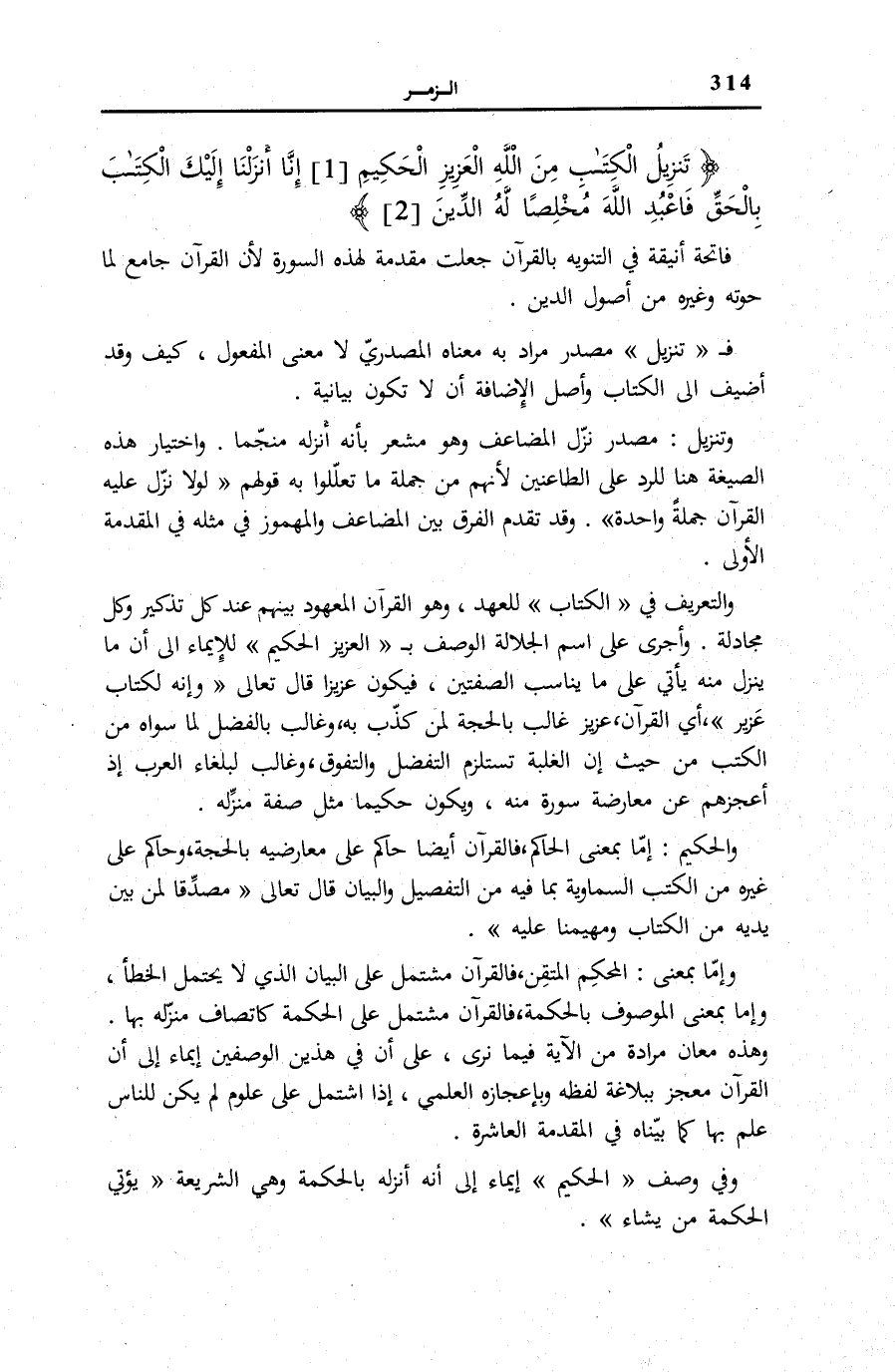 وَالتَّعْرِيفُ فِي الْكِتابِ لِلْعَهْدِ، وَهُوَ الْقُرْآنُ الْمَعْهُودُ بَيْنَهُمْ عِنْدَ كُلِّ تَذْكِيرٍ وَكُلِّ مُجَادَلَةٍ. وَأَجْرَى عَلَى اسْمِ الْجَلَالَةِ الْوَصْفَ بِ الْعَزِيزِ الْحَكِيمِ لِلْإِيمَاءِ إِلَى أَنَّ مَا يُنَزَّلُ مِنْهُ يَأْتِي عَلَى مَا يُنَاسِبُ الصِّفَتَيْنِ، فَيَكُونُ عَزِيزًا قَالَ تَعَالَى: وَإِنَّهُ لَكِتابٌ عَزِيزٌ [فصلت: 41] ، أَيِ الْقُرْآنُ، عَزِيزٌ غَالِبٌ بِالْحُجَّةِ لِمَنْ كَذَّبَ بِهِ، وَغَالِبٌ بِالْفَضْلِ لِمَا سِوَاهُ مِنَ الْكُتُبِ مِنْ حَيْثُ إِنَّ الْغَلَبَةَ تَسْتَلْزِمُ التَّفَضُّلَ وَالتَّفَوُّقَ، وَغَالِبٌ لِبُلَغَاءِ الْعَرَبِ إِذْ أَعْجَزَهُمْ عَنْ مُعَارَضَةِ سُورَةٍ مِنْهُ، وَيَكُونُ حَكِيمًا مِثْلَ صِفَةِ مُنْزِلِهِ.