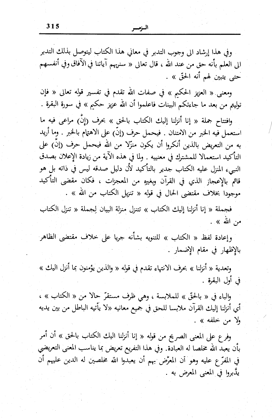 فَجُمْلَةُ إِنَّا أَنْزَلْنا إِلَيْكَ الْكِتابَ تَتَنَزَّلُ مَنْزِلَةَ الْبَيَانِ لِجُمْلَةِ تَنْزِيلُ الْكِتابِ مِنَ اللَّهِ. وَإِعَادَةُ لَفْظِ الْكِتابِ لِلتَّنْوِيهِ بِشَأْنِهِ جَرْيًا عَلَى خِلَافِ مُقْتَضَى الظَّاهِرِ بِالْإِظْهَارِ فِي مَقَامِ الْإِضْمَارِ. وَتَعْدِيَةُ أَنْزَلْنا بِحَرْفِ الِانْتِهَاءِ تَقَدَّمَ فِي قَوْلِهِ: وَالَّذِينَ يُؤْمِنُونَ بِما أُنْزِلَ إِلَيْكَ فِي أَوَّلِ الْبَقَرَةِ [4] .