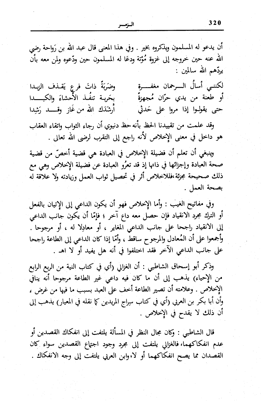 وَذَكَرَ أَبُو إِسْحَاقَ الشَّاطِبِيُّ: أَنَّ الْغَزَالِيَّ- أَيْ فِي كِتَابِ النِّيَّةِ مِنَ الرُّبْعِ الرَّابِعِ مِنَ «الْإِحْيَاءِ» - يَذْهَبُ إِلَى أَنَّ مَا كَانَ فِيهِ دَاعِيَ غَيْرِ الطَّاعَةِ مَرْجُوحًا أَنَّهُ يُنَافِي الْإِخْلَاصَ.