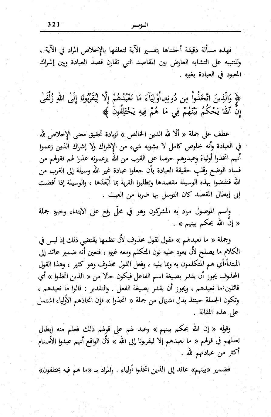 وَقَوْلُهُ: إِنَّ اللَّهَ يَحْكُمُ بَيْنَهُمْ وَعِيدٌ لَهُمْ عَلَى قَوْلِهِمْ ذَلِكَ فَعُلِمَ مِنْهُ إِبْطَالُ تَعَلُّلِهِمْ فِي قَوْلِهِمْ: مَا نَعْبُدُهُمْ إِلَّا لِيُقَرِّبُونا إِلَى اللَّهِ لِأَنَّ الْوَاقِعَ أَنَّهُمْ عَبَدُوا الْأَصْنَامَ أَكْثَرَ من عِبَادَتهم لله. فَضَمِيرُ بَيْنَهُمْ عَائِدٌ إِلَى الَّذِينَ اتَّخَذُوا أَوْلِيَاءَ. وَالْمُرَادُ بِ مَا هُمْ فِيهِ يَخْتَلِفُونَ