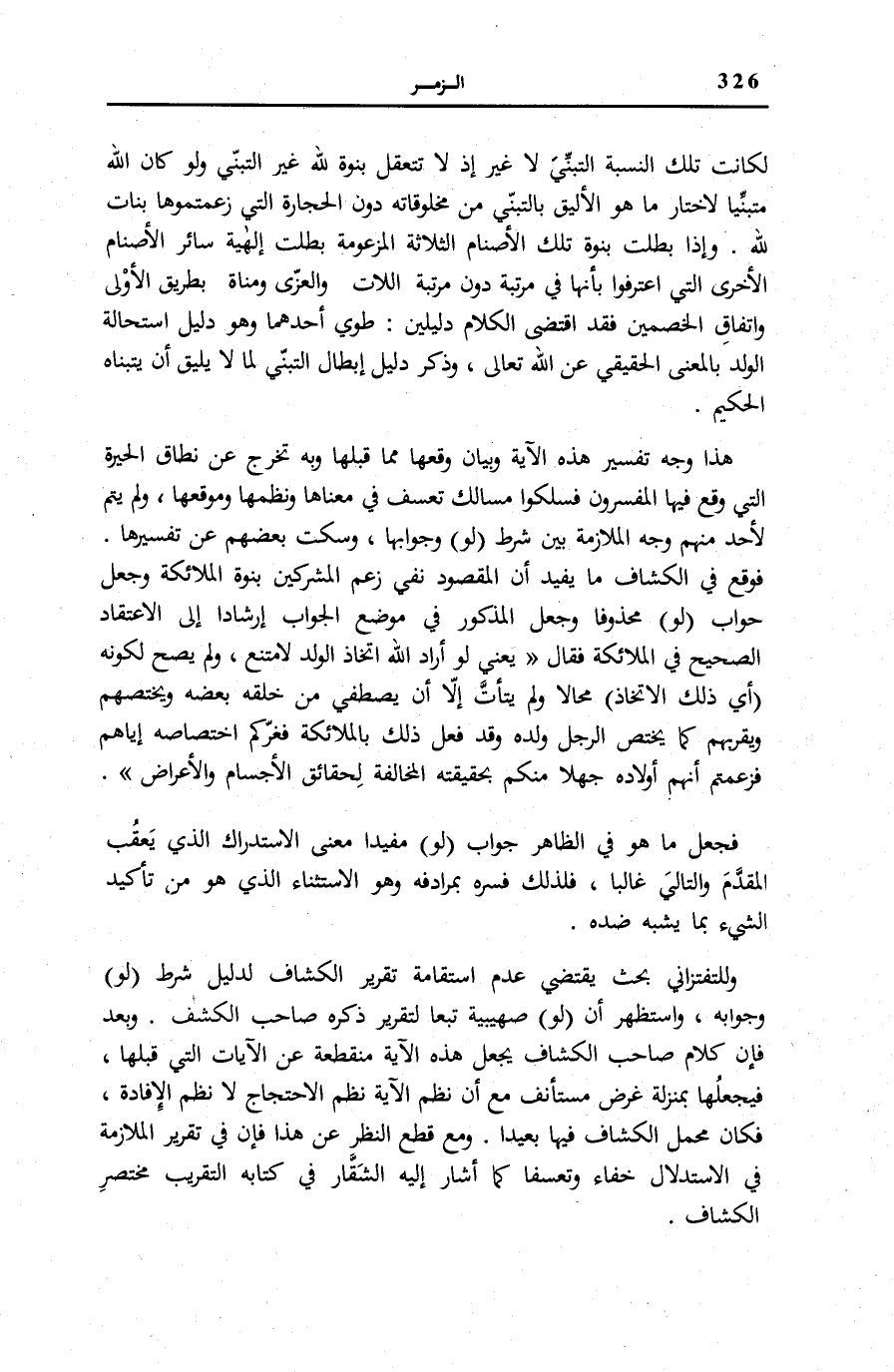 وَلِلْتَفْتَزَانِيِّ بَحْثٌ يَقْتَضِي عَدَمَ اسْتِقَامَةِ تَقْرِيرِ «الْكَشَّافِ» لِدَلِيلِ شَرْطِ لَوْ وَجَوَابِهِ، وَاسْتَظْهَرَ أَنَّ لَوْ صُهَيْبِيَّةٌ تَبَعًا لِتَقْرِيرِ ذكره صَاحب «الْكَشْف» . وَبَعْدُ فَإِنَّ كَلَامَ صَاحِبِ «الْكَشَّافِ» يَجْعَلُ هَذِهِ الْآيَةَ مُنْقَطِعَةً عَنِ الْآيَاتِ الَّتِي قَبْلَهَا، فَيَجْعَلُهَا بِمَنْزِلَةِ غَرَضٍ مُسْتَأْنَفٍ مَعَ أَنَّ نَظْمَ الْآيَةِ نَظْمُ الِاحْتِجَاجِ لَا نَظْمُ الْإِفَادَةِ، فَكَانَ مَحْمَلُ «الْكَشَّافِ» فِيهَا بَعِيدًا. وَمَعَ قَطْعِ النَّظَرِ عَنْ هَذَا فَإِنَّ فِي تَقْرِيرِ الْمُلَازَمَةِ فِي الِاسْتِدْلَالِ خَفَاءً وَتَعَسُّفًا كَمَا أَشَارَ إِلَيْهِ الشَّقَّارُ فِي كِتَابِهِ «التَّقْرِيبُ مُخْتَصَرُ الْكَشَّافِ» .