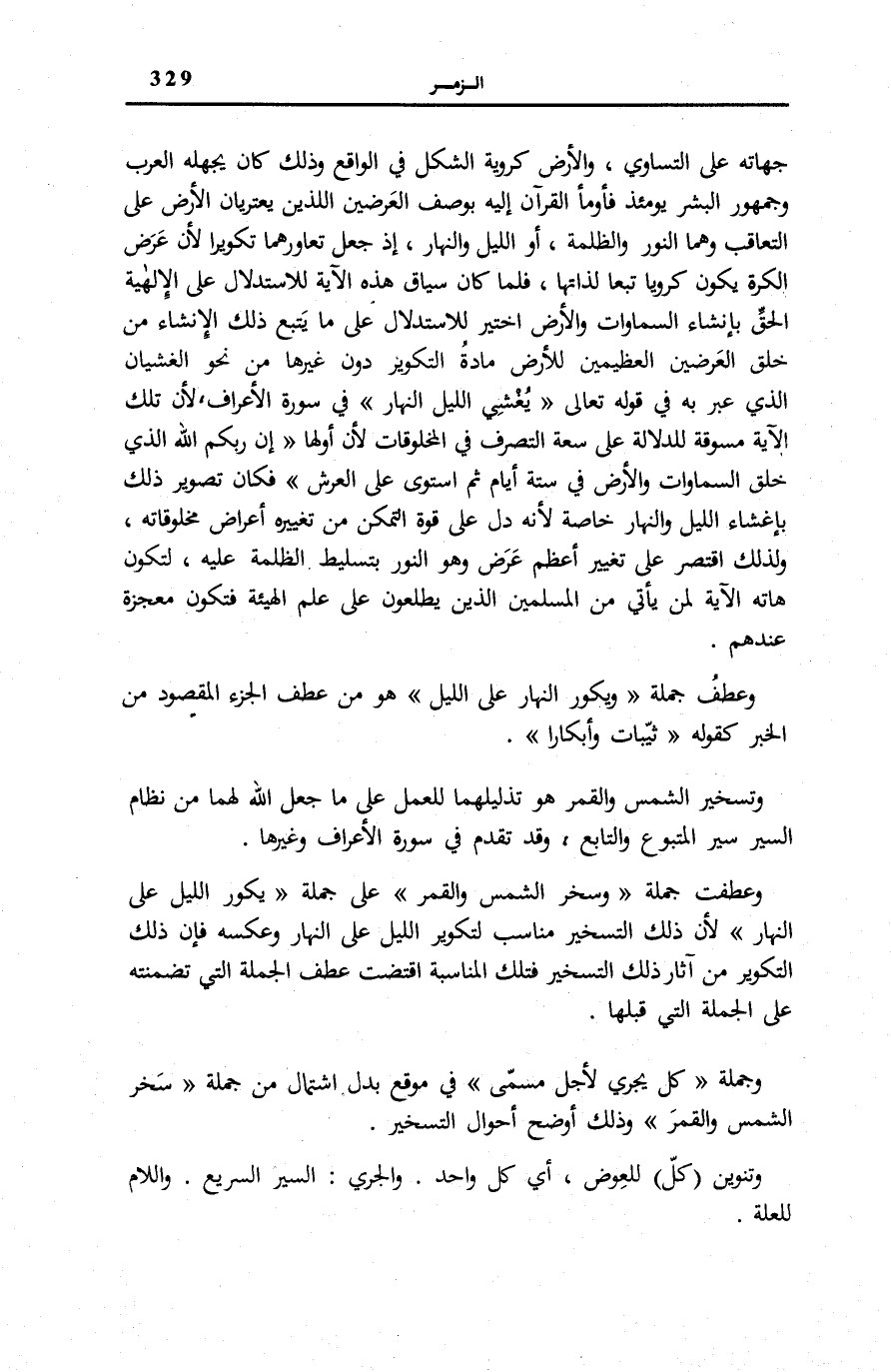 جِهَاتِهِ عَلَى التَّسَاوِي، وَالْأَرْضُ كُرَوِيَّةُ الشَّكْلِ فِي الْوَاقِعِ وَذَلِكَ كَانَ يَجْهَلُهُ الْعَرَبُ وَجُمْهُورُ الْبَشَرِ يَوْمَئِذٍ فَأَوْمَأَ الْقُرْآنُ إِلَيْهِ بِوَصْفِ الْعَرَضَيْنِ اللَّذَيْنِ يَعْتَرِيَانِ الْأَرْضَ عَلَى التَّعَاقُبِ وَهُمَا النُّورُ وَالظُّلْمَةُ، أَوِ اللَّيْلُ وَالنَّهَارُ، إِذْ جَعَلَ تَعَاوُرَهُمَا تَكْوِيرًا لِأَنَّ عَرَضَ الْكُرَةِ يَكُونُ كُرَوِيًّا تَبَعًا لِذَاتِهَا، فَلَمَّا كَانَ سِيَاقُ هَذِهِ الْآيَةِ لِلِاسْتِدْلَالِ عَلَى الْإِلَهِيَّةِ الْحَقِّ بِإِنْشَاءِ السَّمَاوَاتِ وَالْأَرْضِ اخْتِيرَ لِلِاسْتِدْلَالِ عَلَى مَا يَتْبَعُ ذَلِكَ الْإِنْشَاءَ مِنْ خَلْقِ الْعَرَضَيْنِ الْعَظِيمَيْنِ لِلْأَرْضِ مَادَّةِ التَّكْوِيرِ دُونَ غَيْرِهَا مِنْ نَحْوِ الْغَشَيَانِ الَّذِي عُبِّرَ بِهِ فِي قَوْلِهِ تَعَالَى: يُغْشِي اللَّيْلَ النَّهارَ فِي سُورَةِ الْأَعْرَافِ [54] ، لِأَنَّ تِلْكَ الْآيَةَ مَسُوقَةٌ لِلدَّلَالَةِ عَلَى سَعَةِ التَّصَرُّفِ فِي الْمَخْلُوقَاتِ لِأَنَّ أَوَّلَهَا إِنَّ رَبَّكُمُ اللَّهُ الَّذِي خَلَقَ السَّماواتِ وَالْأَرْضَ فِي سِتَّةِ أَيَّامٍ ثُمَّ اسْتَوى عَلَى الْعَرْشِ [الْأَعْرَاف: 54] فَكَانَ تَصْوِيرُ ذَلِكَ بِإِغْشَاءِ اللَّيْلِ وَالنَّهَارِ خَاصَّةً لِأَنَّهُ دَلَّ عَلَى قُوَّةِ التَّمَكُّنِ مِنْ تَغْيِيرِهِ أَعْرَاضَ مَخْلُوقَاتِهِ، وَلِذَلِكَ اقْتَصَرَ عَلَى تَغْيِيرِ أَعْظَمِ عَرَضٍ وَهُوَ النُّورُ بِتَسْلِيطِ الظُّلْمَةِ عَلَيْهِ، لِتَكُونَ هَاتِهِ الْآيَةُ لِمَنْ يَأْتِيَ مِنَ الْمُسْلِمِينَ الَّذِينَ يَطَّلِعُونَ عَلَى عِلْمِ الْهَيْئَةِ فَتَكُونُ مُعْجِزَةً عِنْدَهُمْ.