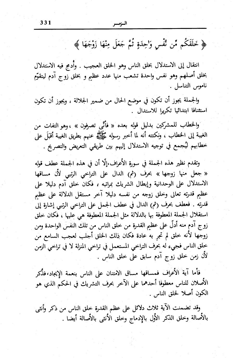 وَالْخِطَابُ لِلْمُشْرِكِينَ بِدَلِيلِ قَوْلِهِ بَعْدَهُ: فَأَنَّى تُصْرَفُونَ، وَهُوَ الْتِفَاتٌ مِنَ الْغَيْبَةِ إِلَى الْخِطَابِ، وَنُكْتَتُهُ أَنَّهُ لَمَّا أَخْبَرَ رَسُولَهُ صَلَّى اللهُ عَلَيْهِ وَسَلَّمَ عَنْهُمْ بِطَرِيقِ الْغَيْبَةِ أَقْبَلَ عَلَى خِطَابِهِمْ لِيَجْمَعَ فِي تَوْجِيهِ الِاسْتِدْلَالِ إِلَيْهِمْ بَيْنَ طَرِيقَيِ التَّعْرِيضِ وَالتَّصْرِيحِ. وَتَقَدَّمَ نَظِيرُ هَذِهِ الْجُمْلَةِ فِي سُورَةِ الْأَعْرَافِ، إِلَّا أَنَّ فِي هَذِهِ الْجُمْلَةِ عُطِفَ قَوْلُهُ: جَعَلَ مِنْها زَوْجَها بِحَرْفِ ثُمَّ الدَّالُّ عَلَى التَّرَاخِي الرُّتْبِي لِأَنَّ مَسَاقَهَا الِاسْتِدْلَالُ عَلَى الْوَحْدَانِيَّةِ وَإِبْطَالِ الشَّرِيكِ بِمَرَاتِبِهِ، فَكَانَ خَلْقُ آدَمَ دَلِيلًا عَلَى عَظِيمِ قُدْرَتِهِ تَعَالَى وَخَلْقُ زَوْجِهِ مِنْ نَفْسِهِ دَلِيلًا آخَرَ مُسْتَقِلُّ الدَّلَالَةِ عَلَى عَظِيمِ قُدْرَتِهِ. فَعُطِفَ بِحَرْفِ ثُمَّ الدَّالِّ فِي عَطْفِ الْجُمَلِ عَلَى التَّرَاخِي الرُّتْبِي إِشَارَةً إِلَى اسْتِقْلَالِ الْجُمْلَةِ الْمَعْطُوفَةِ بِهَا بِالدَّلَالَةِ مِثْلَ الْجُمْلَةِ الْمَعْطُوفَةِ هِيَ عَلَيْهَا، فَكَانَ خَلْقُ زَوْجِ آدَمَ مِنْهُ أَدَلَّ عَلَى عَظِيمِ الْقُدْرَةِ مِنْ خَلْقِ النَّاسِ مِنْ تِلْكَ النَّفْسِ الْوَاحِدَةِ وَمِنْ زَوْجِهَا لِأَنَّهُ خَلَقٌ لَمْ تَجْرِ بِهِ عَادَةٌ فَكَانَ ذَلِكَ الْخَلْقُ أَجْلَبُ لِعَجَبِ السَّامِعِ مِنْ خَلْقِ النَّاسِ فَجِيءَ لَهُ بِحَرْفِ التَّرَاخِي الْمُسْتَعْمَلِ فِي تَرَاخِي الْمَنْزِلَةِ لَا فِي تَرَاخِي الزَّمَنِ لِأَنَّ زَمَنَ خَلْقِ زَوْجِ آدَمَ سَابِقٌ عَلَى خَلْقِ النَّاسِ. فَأَمَّا آيَةُ الْأَعْرَافِ فَمَسَاقُهَا مَسَاقُ الِامْتِنَانِ عَلَى النَّاسِ بِنِعْمَةِ الْإِيجَادِ، فَذُكِرَ الْأَصْلَانَ لِلنَّاسِ مَعْطُوفًا أَحَدُهُمَا عَلَى الْآخَرِ بِحَرْفِ التَّشْرِيكِ فِي الْحُكْمِ الَّذِي هُوَ الْكَوْنُ أَصْلًا لِخَلْقِ النَّاسِ.