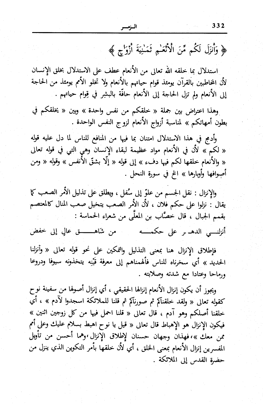 فَإِطْلَاقُ الْإِنْزَالِ هُنَا بِمَعْنَى التَّذْلِيلِ وَالتَّمْكِينِ عَلَى نَحْوِ قَوْلِهِ تَعَالَى: وَأَنْزَلْنَا الْحَدِيدَ [الْحَدِيدَ: 25] أَيْ سَخَّرْنَاهُ لِلنَّاسِ فَأَلْهَمْنَاهُمْ إِلَى مَعْرِفَةِ قَيْنِهِ يَتَّخِذُونَهُ سُيُوفًا وَدُرُوعًا وَرِمَاحًا وَعَتَادًا مَعَ شِدَّتِهِ وَصَلَابَتِهِ. وَيَجُوزُ أَنْ يَكُونَ إِنْزَالُ الْأَنْعَامِ إِنْزَالَهَا الْحَقِيقِيَّ، أَيْ إِنْزَالُ أُصُولِهَا مِنْ سَفِينَةِ نُوحٍ كَقَوْلِهِ تَعَالَى: وَلَقَدْ خَلَقْناكُمْ ثُمَّ صَوَّرْناكُمْ ثُمَّ قُلْنا لِلْمَلائِكَةِ اسْجُدُوا لِآدَمَ [الْأَعْرَاف: 11] ، أَيْ خَلَقْنَا أَصْلَكُمْ وَهُوَ آدَمُ، قَالَ تَعَالَى: قُلْنَا احْمِلْ فِيها مِنْ كُلٍّ زَوْجَيْنِ اثْنَيْنِ [هود: 40] فَيَكُونُ الْإِنْزَالُ هُوَ الْإِهْبَاطُ قَالَ تَعَالَى: قِيلَ يَا نُوحُ اهْبِطْ بِسَلامٍ مِنَّا وَبَرَكاتٍ عَلَيْكَ وَعَلى أُمَمٍ مِمَّنْ مَعَكَ [هود: 48] ، فَهَذَانِ وَجْهَانِ حَسَنَانِ لِإِطْلَاقِ الْإِنْزَالِ، وَهُمَا أَحْسَنُ مِنْ تَأْوِيلِ الْمُفَسِّرِينَ إِنْزَالَ الْأَنْعَامِ بِمَعْنَى الْخَلْقِ، أَيْ لِأَنَّ خَلْقَهَا بِأَمْر التكوين الَّذِي يَنْزِلُ مِنْ حَضْرَةِ الْقُدْسِ إِلَى الْمَلَائِكَةِ.