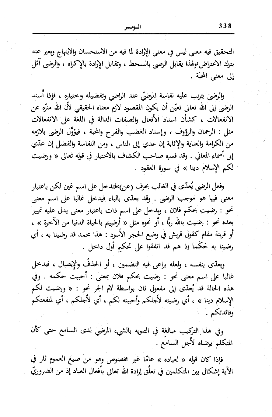 التَّحْقِيقِ فِيهِ مَعْنًى لَيْسَ فِي مَعْنَى الْإِرَادَةِ لِمَا فِيهِ مِنَ الِاسْتِحْسَانِ وَالِابْتِهَاجِ وَيُعَبَّرُ عَنْهُ بِتَرْكِ الِاعْتِرَاضِ، وَلِهَذَا يُقَابَلُ الرِّضَى بِالسُّخْطِ، وَتُقَابَلُ الْإِرَادَةُ بِالْإِكْرَاهِ، وَالرِّضَى آئِلٌ إِلَى مَعْنَى الْمَحَبَّةِ. وَالرِّضَى يَتَرَتَّبُ عَلَيْهِ نَفَاسَةُ الْمَرْضِيِّ عِنْدَ الرَّاضِي وَتَفْضِيلُهُ وَاخْتِيَارُهُ، فَإِذَا أُسْنِدَ الرِّضَى إِلَى اللَّهِ تَعَالَى تَعَيَّنَ أَنْ يَكُونَ الْمَقْصُودُ لَازَمَ مَعْنَاهُ الْحَقِيقِيَّ لِأَنَّ اللَّهَ مُنَزَّهٌ عَنِ الِانْفِعَالَاتِ، كَشَأْنِ إِسْنَادِ الْأَفْعَالِ وَالصِّفَاتِ الدَّالَّةِ فِي اللُّغَةِ عَلَى الانفعالات مثل:
