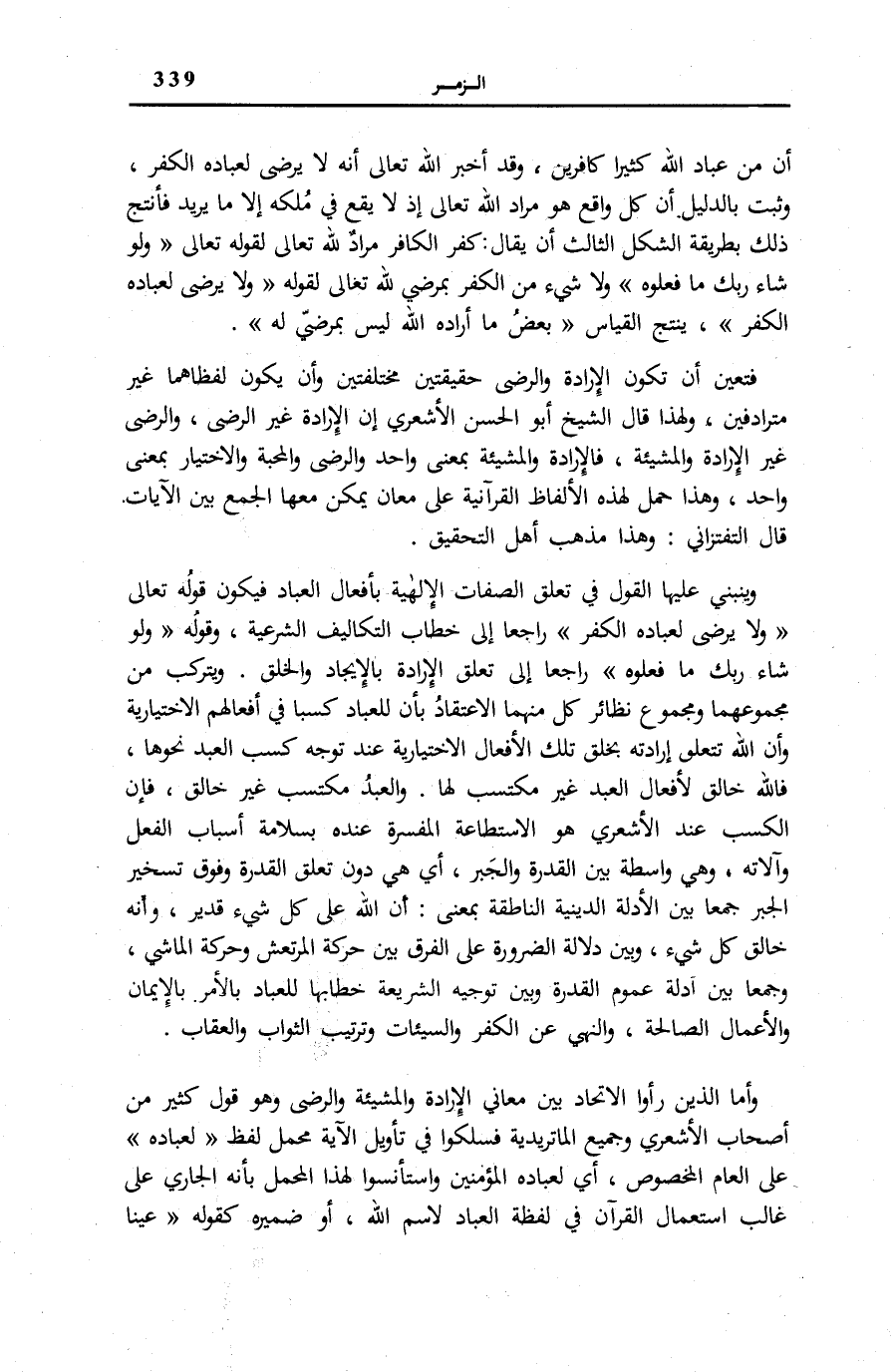 أَنَّ مِنْ عِبَادِ اللَّهِ كَثِيرًا كَافِرِينَ، وَقَدْ أَخْبَرَ اللَّهُ تَعَالَى أَنَّهُ لَا يَرْضَى لِعِبَادِهِ الْكُفْرَ، وَثَبَتَ بِالدَّلِيلِ أَنَّ كُلَّ وَاقِعٍ هُوَ مُرَادُ اللَّهِ تَعَالَى إِذْ لَا يَقَعُ فِي مُلْكِهِ إِلَّا مَا يُرِيدُ فَأَنْتَجَ ذَلِكَ بِطَرِيقَةِ الشَّكْلِ الثَّالثِ أَنْ يُقَالَ: كُفْرُ الْكَافِرُ مُرَادٌ لِلَّهِ تَعَالَى لِقَوْلِهِ تَعَالَى: وَلَوْ شاءَ رَبُّكَ مَا فَعَلُوهُ [الْأَنْعَام: 112] وَلَا شَيْءَ من الْكفْر بمرضي لِلَّهِ تَعَالَى لِقَوْلِهِ: وَلا يَرْضى لِعِبادِهِ الْكُفْرَ، يَنْتِجُ الْقِيَاسُ بَعْضُ مَا أَرَادَهُ الله لَيْسَ بمرضي لَهُ فَتَعَيَّنَ أَنْ تَكُونَ الْإِرَادَةُ وَالرِّضَى حَقِيقَتَيْنِ مُخْتَلِفَتَيْنِ وَأَنْ يَكُونَ لَفْظَاهُمَا غَيْرَ مُتَرَادِفَيْنِ، وَلِهَذَا قَالَ الشَّيْخُ أَبُو الْحَسَنِ الْأَشْعَرِيُّ إِنَّ الْإِرَادَةَ غَيْرُ الرِّضَى، وَالرِّضَى غَيْرُ الْإِرَادَةِ وَالْمَشِيئَةِ، فَالْإِرَادَةُ وَالْمَشِيئَةُ بِمَعْنًى وَاحِدٍ وَالرِّضَى وَالْمَحَبَّةُ وَالِاخْتِيَارُ بِمَعْنًى وَاحِدٍ، وَهَذَا حَمْلٌ لِهَذِهِ الْأَلْفَاظِ الْقُرْآنِيَّةِ عَلَى مَعَانٍ يُمْكِنُ مَعَهَا الْجَمْعُ بَيْنَ الْآيَات قَالَ التفتازانيّ: وَهَذَا مَذْهَبُ أَهْلِ التَّحْقِيقِ.
