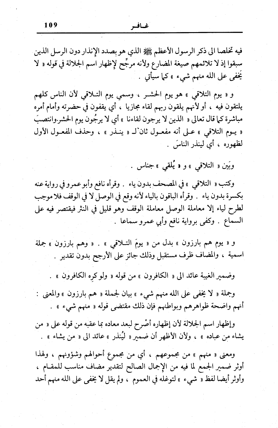 وَكتب التَّلاقِ فِي الْمُصْحَفِ بِدُونِ يَاءٍ. وَقَرَأَهُ نَافِعٌ وَأَبُو عَمْرٍو فِي رِوَايَةٍ عَنْهُ بِكَسْرَةٍ بِدُونِ يَاءٍ. وَقَرَأَهُ الْبَاقُونَ بِالْيَاءِ لِأَنَّهُ وَقَعَ فِي الْوَصْلِ لَا فِي الْوَقْفِ فَلَا مُوجِبَ لِطَرْحِ الْيَاءِ إِلَّا مُعَامَلَةُ الْوَصْلِ مُعَامَلَةَ الْوَقْفِ وَهُوَ قَلِيلٌ فِي النَّثْرِ فَيَقْتَصِرُ فِيهِ عَلَى السَّمَاعِ. وَكَفَى بِرِوَايَةِ نَافِعٍ وَأَبِي عَمْرٍو سَمَاعًا.
