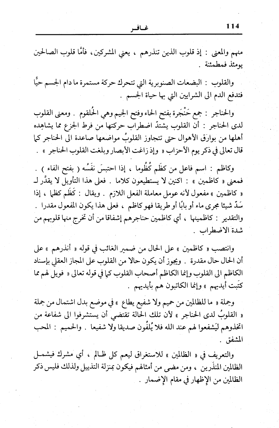وَالْحَنَاجِرُ: جَمْعُ حَنْجَرَةٍ بِفَتْحِ الْحَاءِ وَفَتْحِ الْجِيمِ وَهِيَ الْحُلْقُومُ. وَمَعْنَى الْقُلُوبُ لَدَى الْحَنَاجِرِ: أَنَّ الْقُلُوبَ يَشْتَدُّ اضْطِرَابُ حَرَكَتِهَا مِنْ فَرْطِ الْجزع مِمَّا يُشَاهِدهُ أَهْلُهَا مِنْ بَوَارِقِ الْأَهْوَالِ حَتَّى تَتَجَاوَزَ الْقُلُوبُ مَوَاضِعَهَا صَاعِدَةً إِلَى الْحَنَاجِرِ كَمَا قَالَ تَعَالَى فِي ذِكْرِ يَوْمِ الْأَحْزَابِ: وَإِذْ زاغَتِ الْأَبْصارُ وَبَلَغَتِ الْقُلُوبُ الْحَناجِرَ [الْأَحْزَاب: 10] .